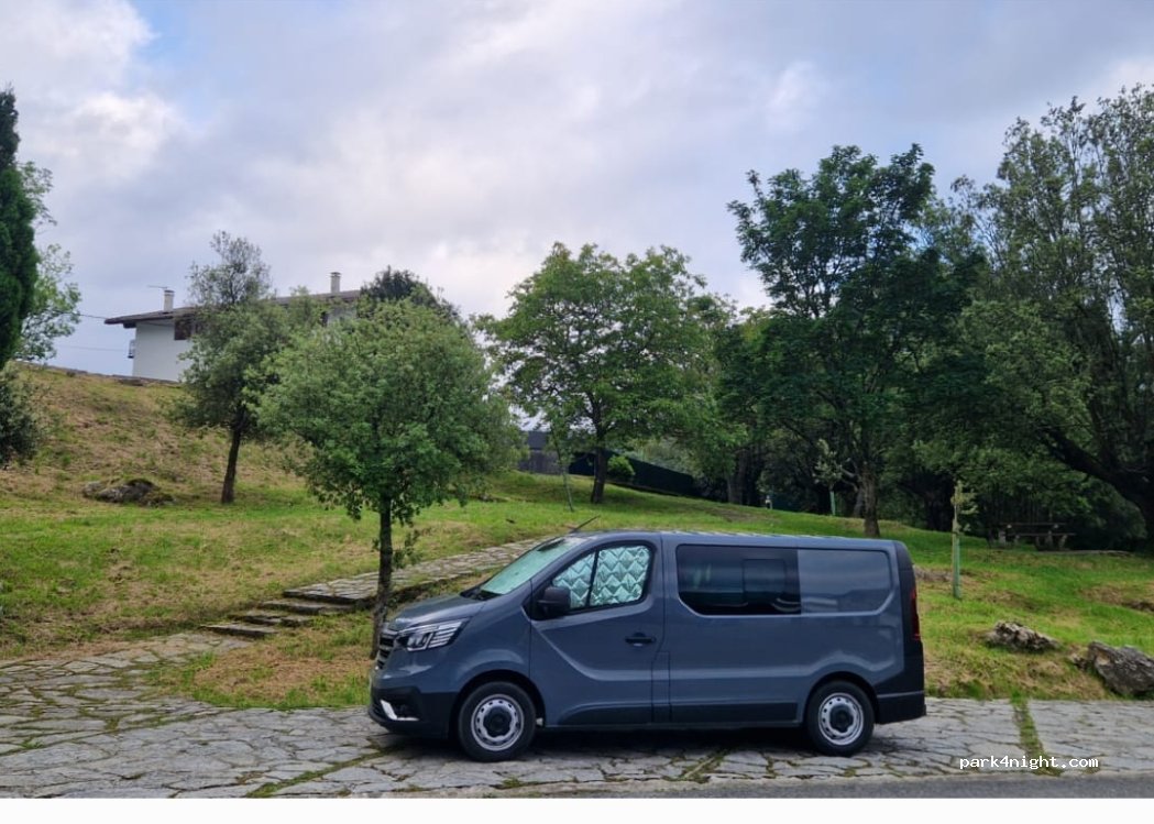 great parking lot only 20 minutes from chaotic San Sebastian. the parking lot is small but just before that there's a clearance on the right hand side that fits a couple of vans. bit of a slope but not too bad, we had a quiet night and woke up with goats outside