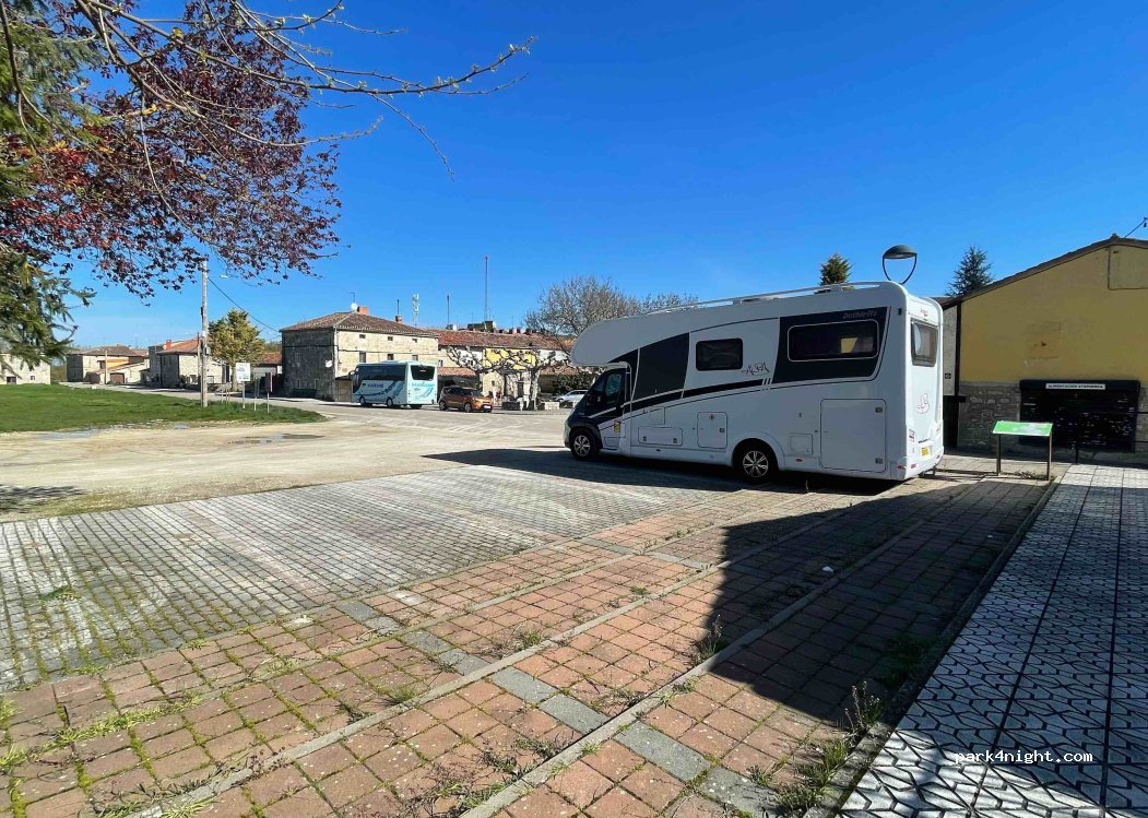 We spent own night here. A peaceful village directly on the Camino de Santiago. There is a bar/restaurant across the road plus a small grocery shop (tried the bar but not the shop). The police parked there in the car park in the morning but didn’t say anything so we assume it’s ok to spend the night there. It’s not quite level however so you might want to park on the muddier part.