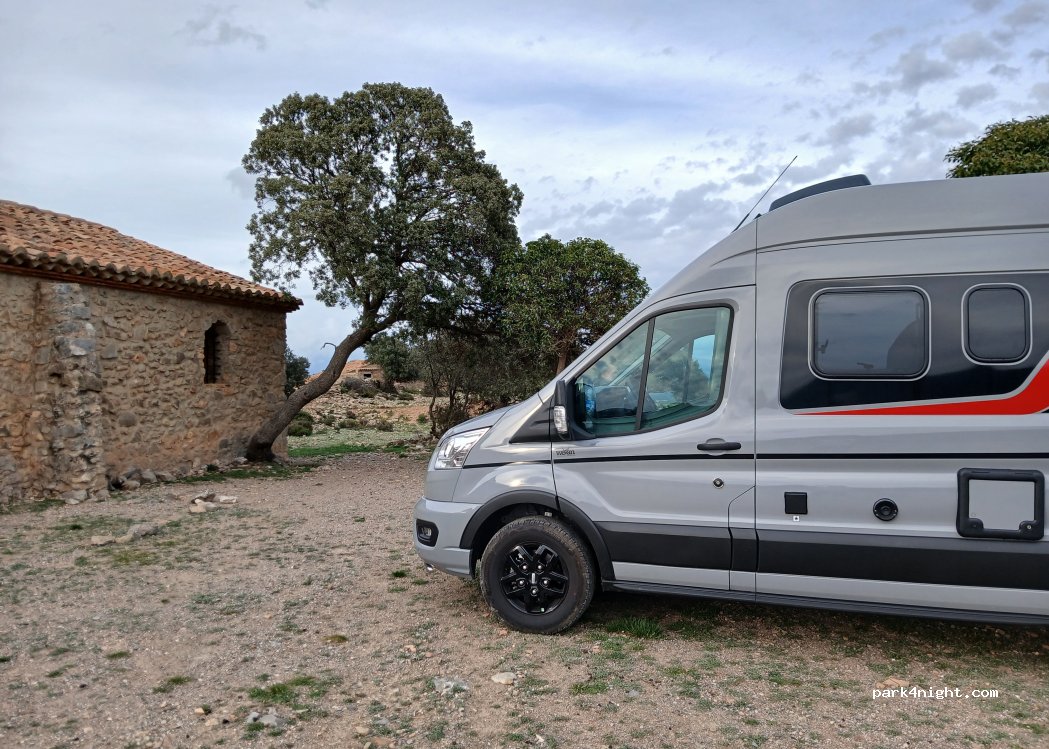 Sitio bueno para pernoctar tranquilo junto a una ermita y una explanada muy grande, hay barbacoas mesas y fuente de agua, el acceso es a través de un camino de tierra pero que está en buen estado tanto para furgonetas como autocaravanas