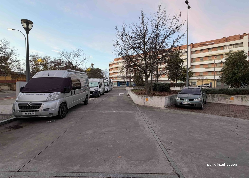 Stayed 2 nights in early May 2023. Quiet at night, great location, 5 mins walk to the old town. Large park 3 mins away including the cuidad de los niños for the kids. Car park does get full so please park considerately. Better for smaller vans, big vehicles may struggle to navigate corners within the marked parking area - note cars do not just park in the bays but all along the sides also!