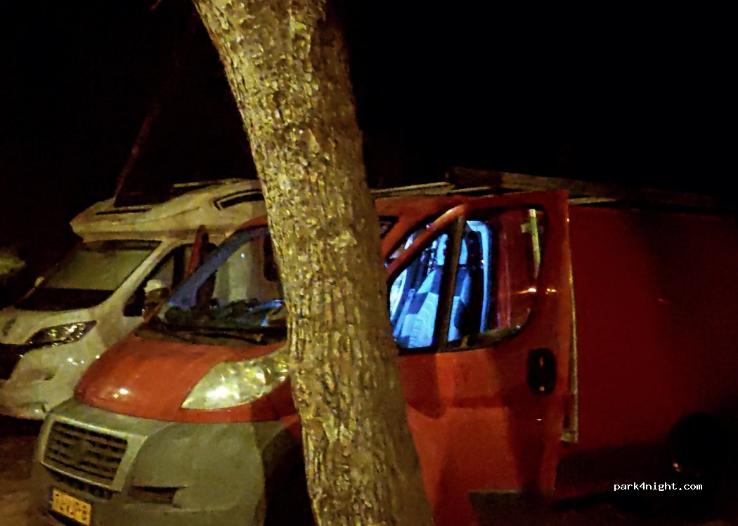 dos estrellas por la sombra de los árboles, pero, mucho ruido por el tren, y al lado de la carretera, para dormir con las ventanas abiertas, cero vigilancia, pero hay muchas caravanas.