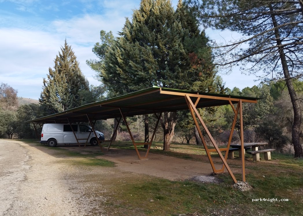 Quiet picnic area for a rest stop and eat, I don't think you can spend the night because it is a protected park. We have found the barbecues closed, of course because it is a fire season. When we were eating, the Civil Guard passed.