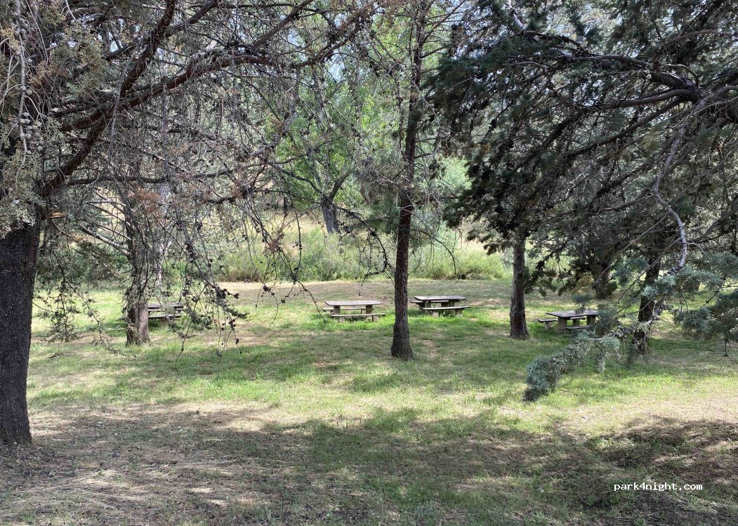 Rustige picknickplaats voor een tussenstop en eten, ik denk niet dat je kunt overnachten omdat het een beschermd park is. We vonden de barbecues gesloten, natuurlijk omdat het een vuurseizoen is. Toen we zaten te eten, kwam de burgerwacht langs.
