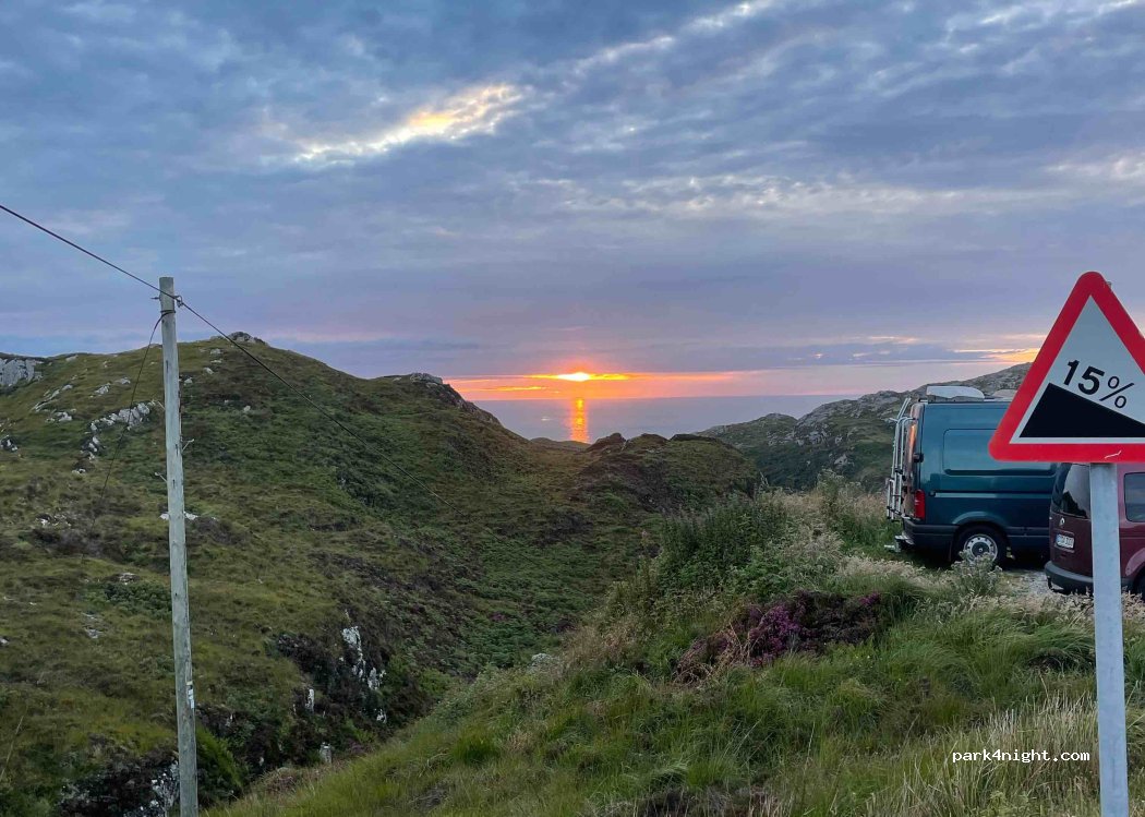 Guter Stellplatz für eine Nacht, sehr ruhig. Die Parkplätze vorher waren alle bereits belegt, daher ist ein zeitiges Kommen sinnvoll, hatten wirklich Glück. Guter Ausgangspunkt für Handa Island am nächsten Morgen. Schöner Sonnenuntergang. Toiletten am Ende der Straße bei der Fähre. Bei wenig Wind können die Midges ein Problem werden, lässt sich am regeln.