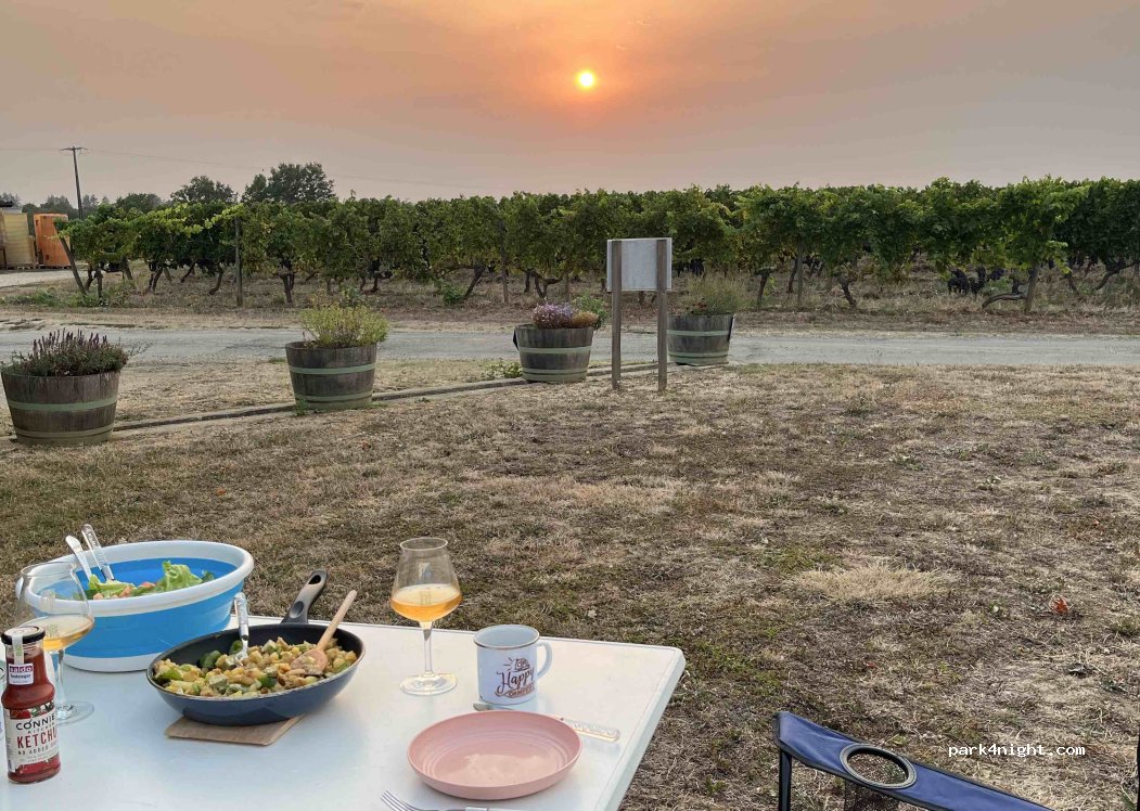 Emplacement calme au bord d’une route très peu passante. On y apprécie le leveret coucher de soleil sur les vignes.