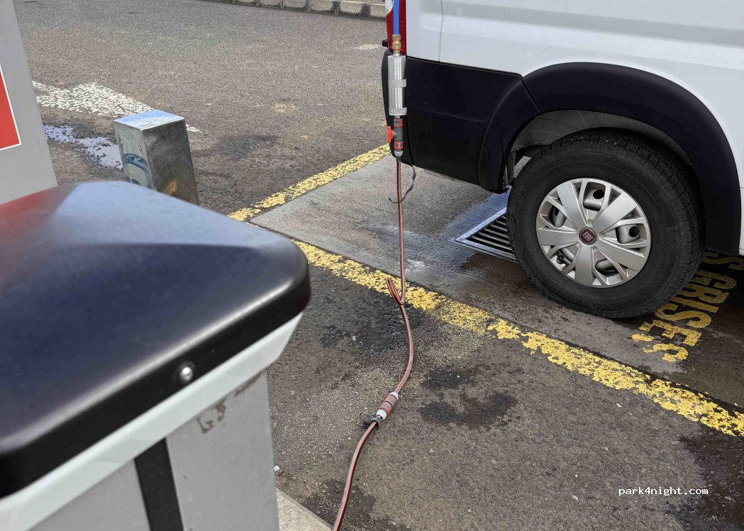 Awesome. The automatic cassette cleaner costs €3, just exchange money for tokens at the till. Fantastic machine. Google maps shows this as a Texaco garage but it's definitely a Tgas station. No water, but you can empty grey waste also. Thank you.
