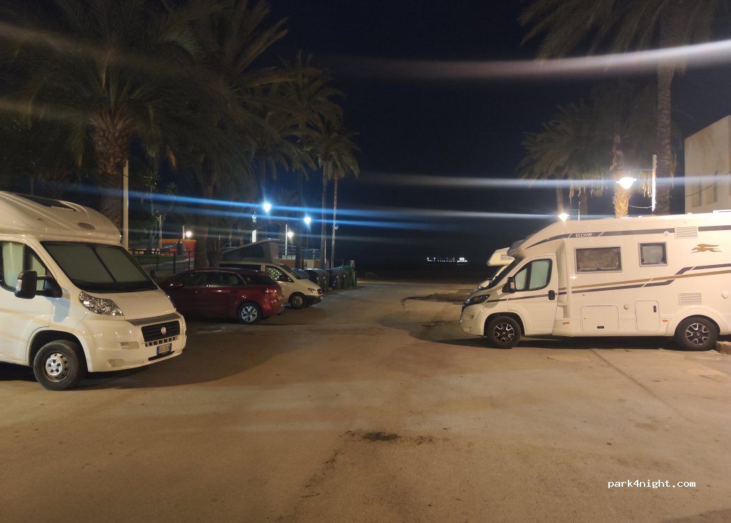 Parcheggio a pagamento a fondo chiuso sul mare, ma in mezzo alle case e per questo poco ventilato. Troppo caldo d'estate per dormire. Bagni e docce di strutture balneari quindi non usufruibili quando sono chiusi. Sosta non consigliata soprattutto d'estate.