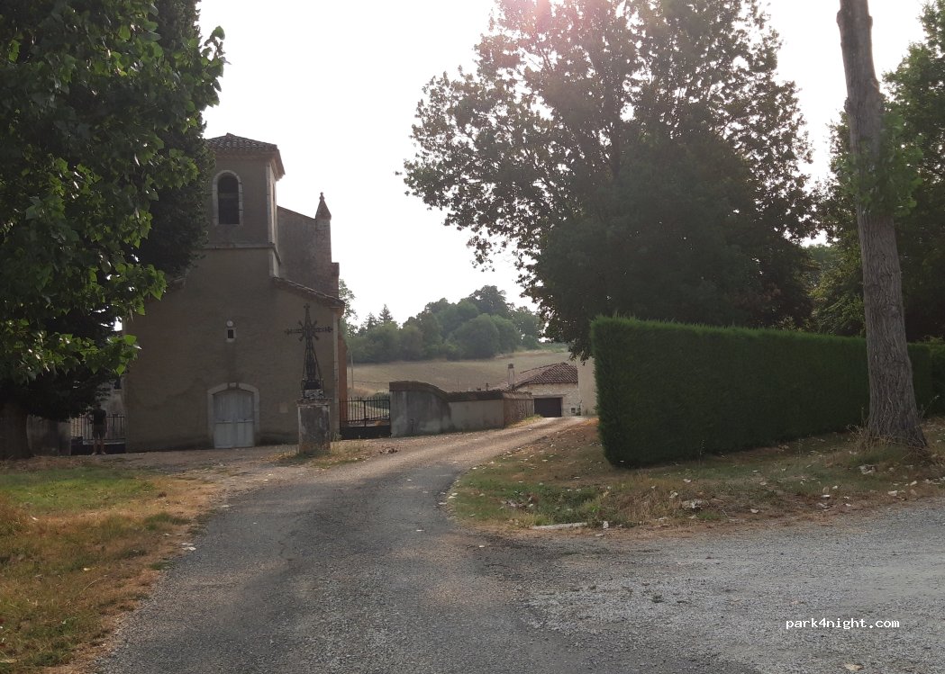 Endroit calme pour passer la nuit. Pas de soleil soir car arbres. Sol stable. Lauzerte à 8km
