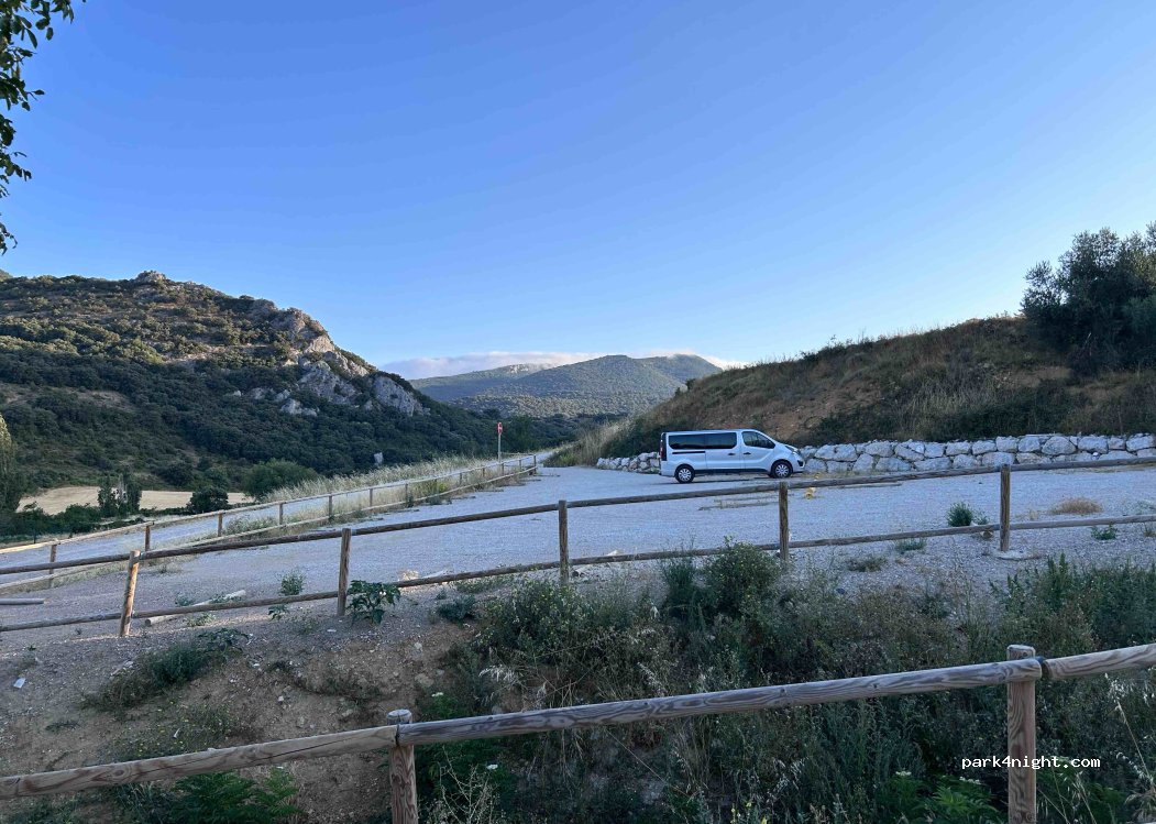 Parking de gravilla. Muy tranquilo, sin apenas ruido. Unas mesas de madera para comer algo. Recomendable.