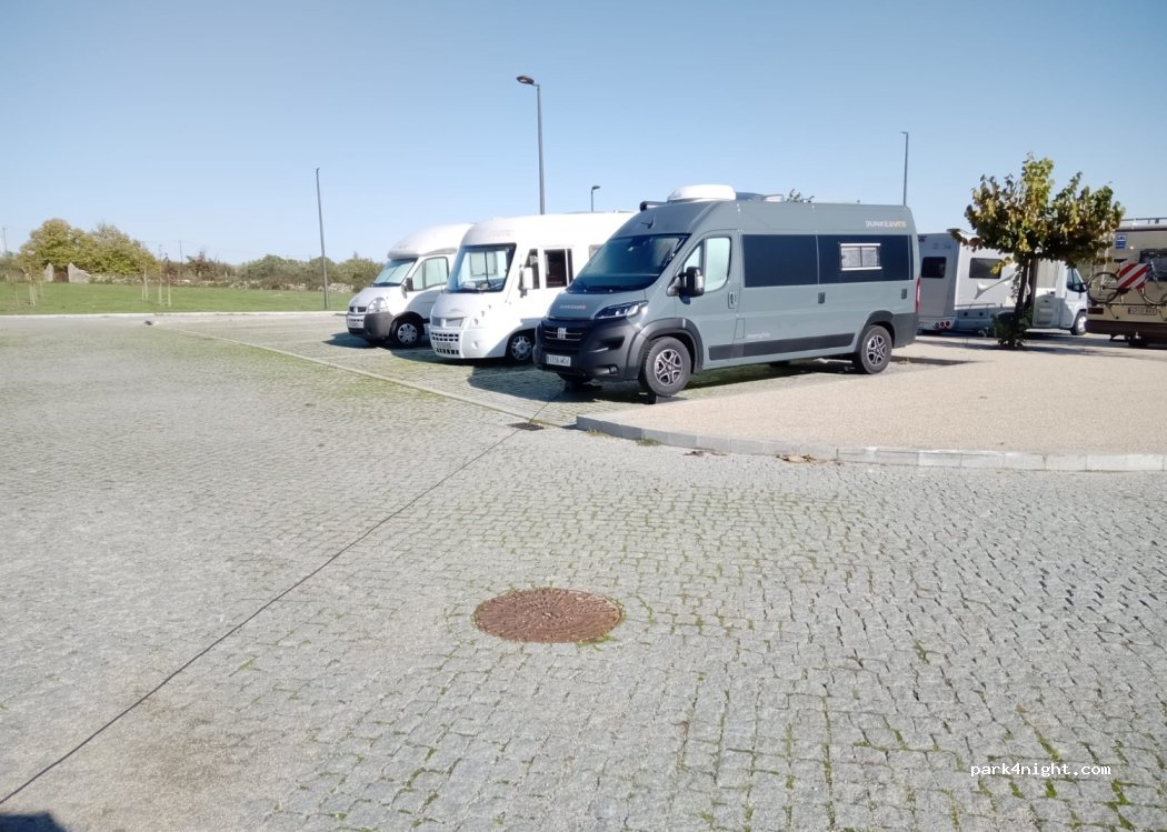 We have just spent two enjoyable nights here which has easy access and very good sized parking spaces. It is in front of the bombeiros and the historical town is literally straight in front about a 5 minute walk. Levelling blocks are required for perfection but not essential. Electricity is supplied and drains for black and grey, fresh water is by token. At night it is extremely well lit, quiet and very safe. There is a supermarket within a 10 minute walk.