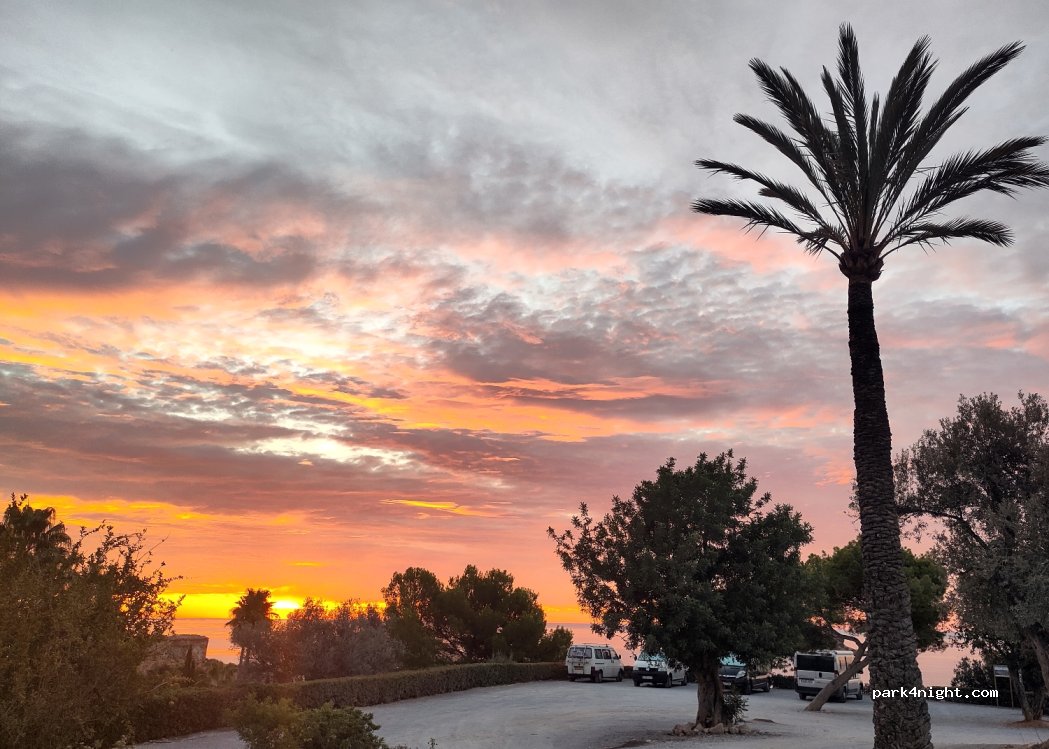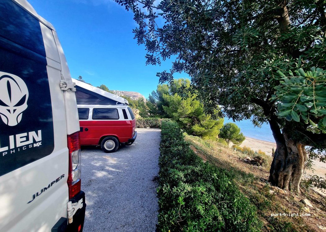 Super sted med flot udsigt og hyggelig strandbar. Man kan godt passere bommen med Campervans på 2,7 m. Politiet rundere jævnligt men ingen problem der. Husk ingen camping adfærd i respekt for stedet og de besøgende. Pladsen er lukket fra den 20/4 til den 22/4 pga. Påsken. Vores favoritsted nær Altea.