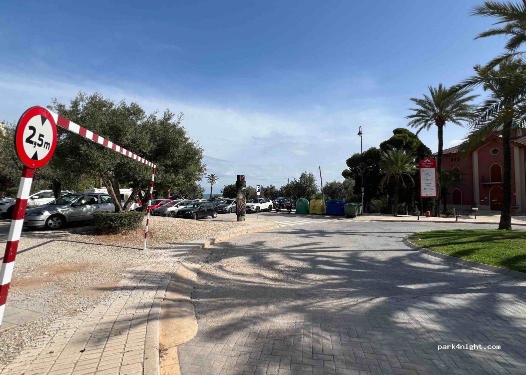 Fantastische plek met dank aan gemeente Altea. Houd het schoon. Foto met slagboom (rood/wit) 2.5 voorbij rijden. Dan pas grote parkeerterrein met grote entree met houten balk op iets hoger dan 2.50. Ik kon er onderdoor met een L2H2 bus. Supermarkt op loopafstand. Politie rijdt regelmatig langs, het is okay. Restaurantje beneden aan zee.