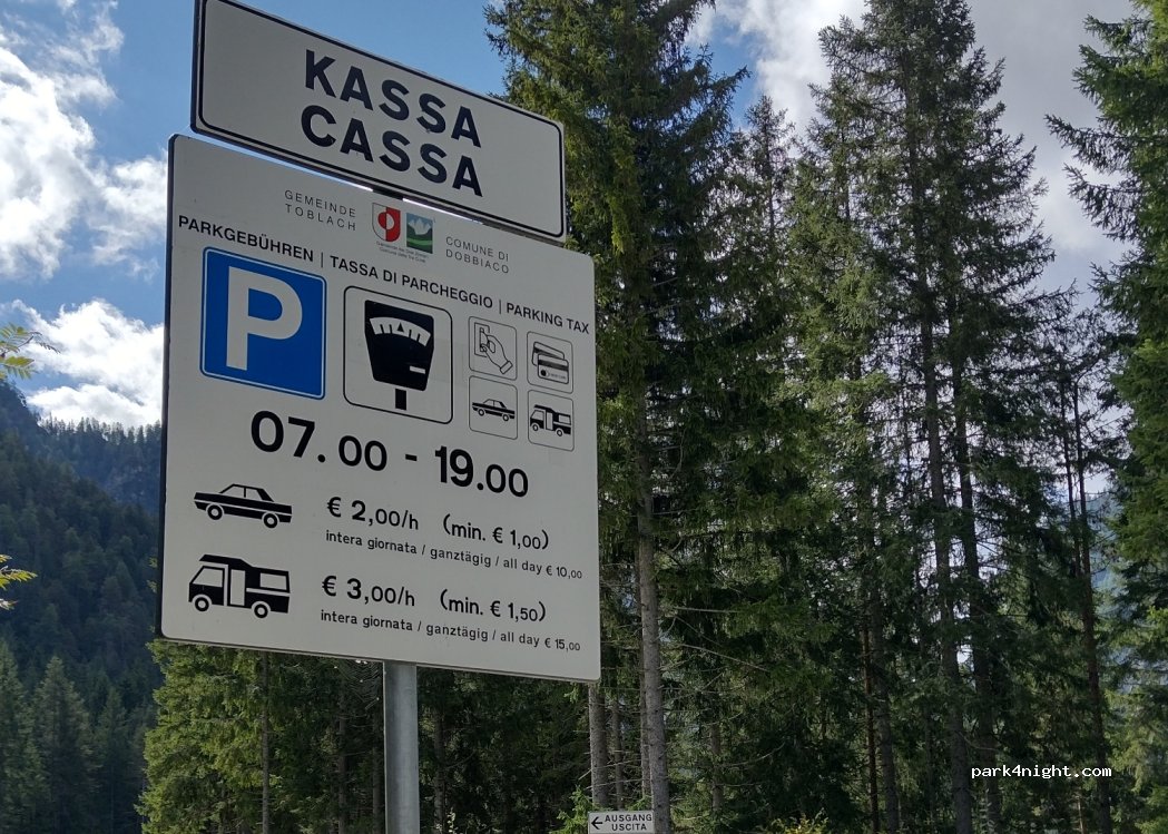 Parkplatz auf der Toblacher Seite. Gegen 20:30 Uhr schließen die Einfahrtsschranken (Sie können aussteigen, indem Sie sich der Schranke nähern). Kein Parken von 22:00 bis 6:00 Uhr