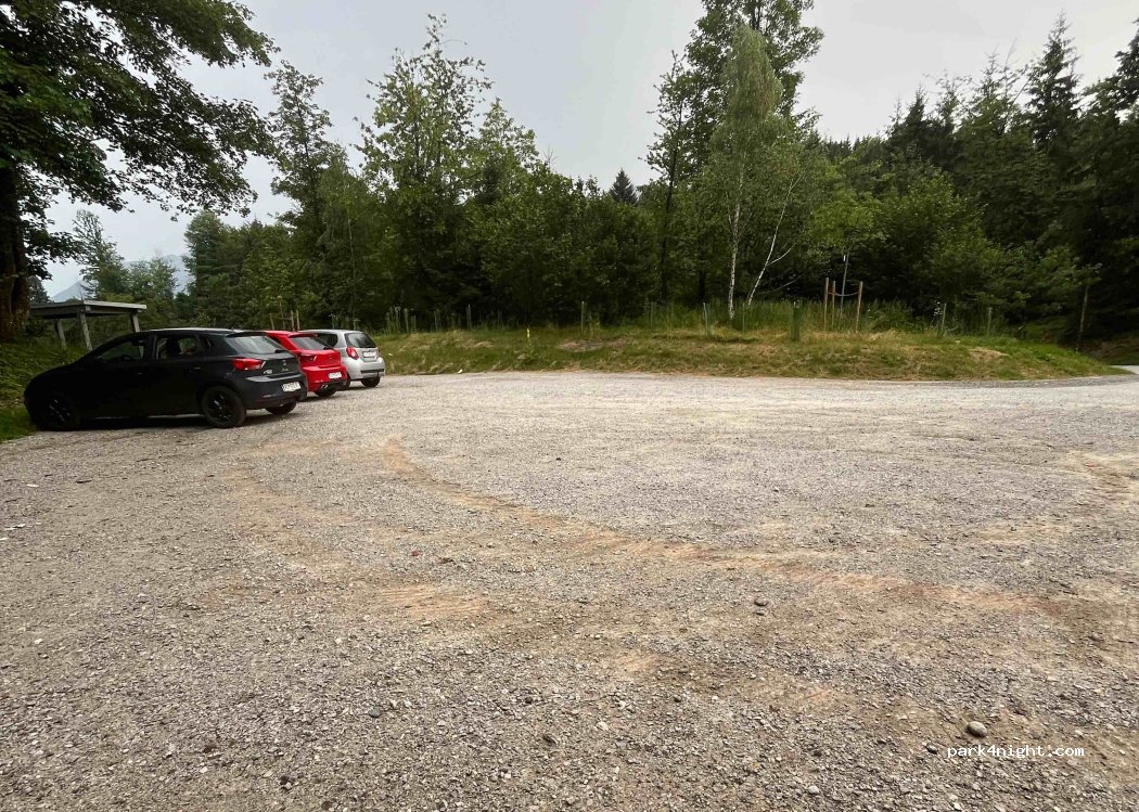 Sehr ruhig gelegen und von Bäumen umgeben. Kostenloser Platz, keinerlei Einschränkungen. Für eine Nacht ideal. Allerdings ist der Parkplatz in Hanglage, sodass größere Wohnmobile schon etwas schauen müssen.