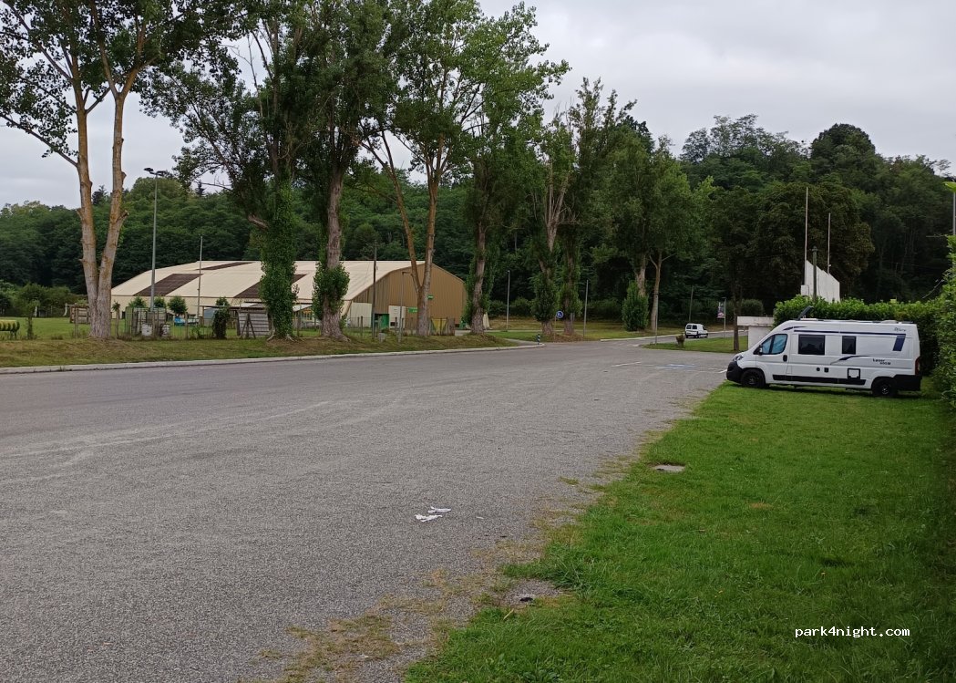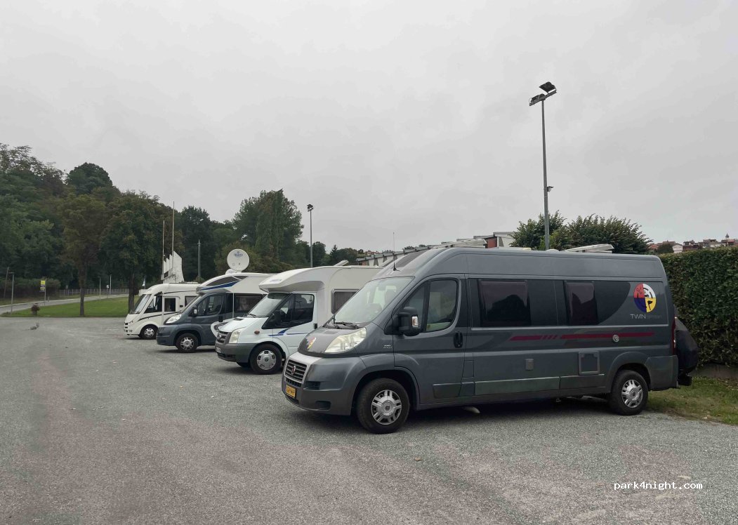 Grand parking (min 25 places) devant le stade et donnant directement accès au lac. Très calme en cette période. Quelques voitures jusqu'à 22h et pas de train entre 22h00 & 08h00. En été très probablement fort fréquenté car café, bar, resto et plage.