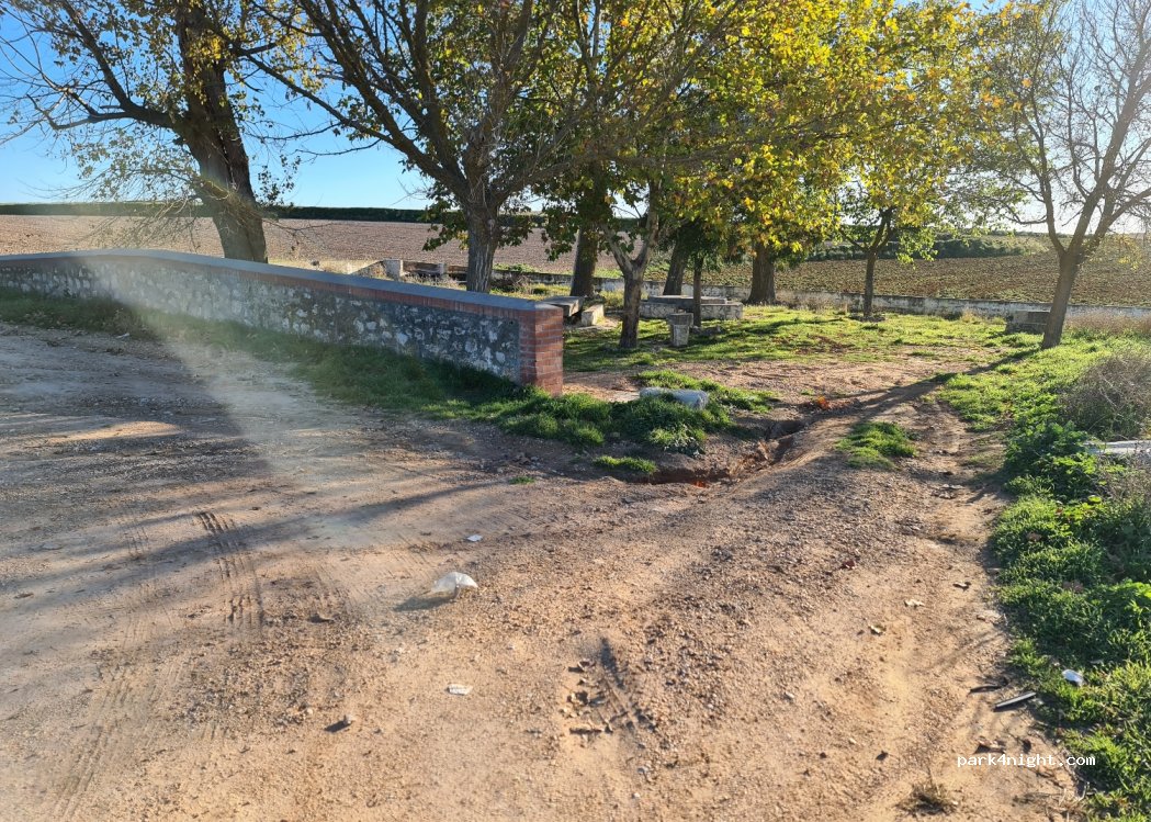 Zona de descanso con mesas, sombra y agua potable. Para tres o cuatro vehiculos. Alejada del núcleo urbano. Posibles paseos en bici y caminatas. Acceso por pista.