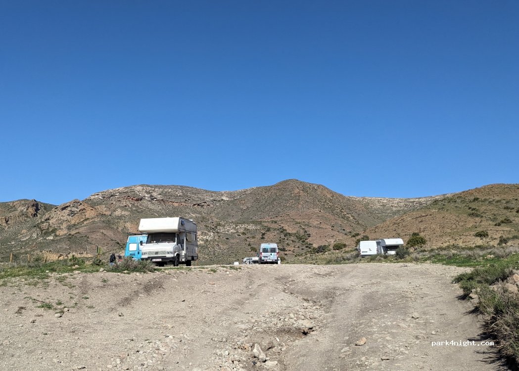 I would have liked to find the place earlier to stay for the night, I saw a few vans so I suppose there is no problem ... It is a beautiful place surrounded by mountains and from there you can walk towards the path that goes to the cove of San Pedro. To get there you have to go down a Rambla, some parts have quite a few stones of which the correntias bring but without problem to pass slowly.