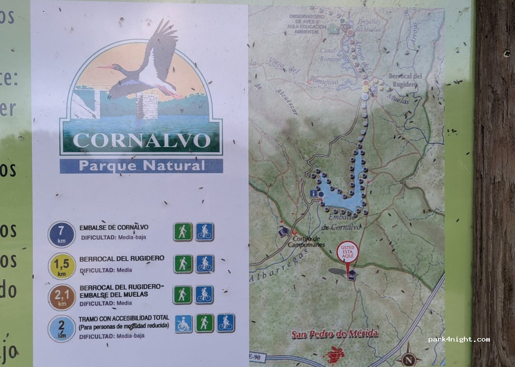 Pequeño aparcamiento sin asfaltar a las afueras del Parque Natural de Cornalvo. Hermosos paseos para hacer en la zona. 0 servicios y tranquilidad garantizada! Acceso por camino de terracería (bien rodante: ok para furgonetas) ya sea desde San Pedro de Mérida o desde Campomanes. ¡Gracias por mantener limpio este lugar!