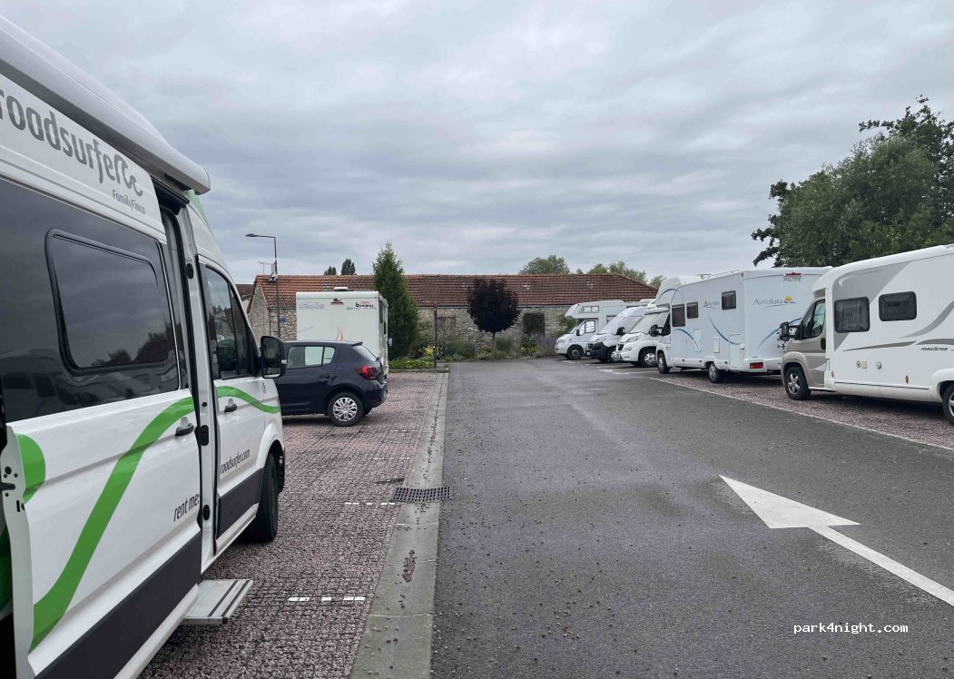 4 belles places de parking, avec un espace entre 2. nous y sommes allés en sortant du parc Astérix, il y avait une 10 e de camping car. Nous avons eu la chance d'avoir une place sur le parking d'à côté. Nous avons super bien dormi, au calme. boulangerie à côté. wc et eaux usées ok. mais pas d'eau gratuite. Parfait. Un GRAND MERCI à la municipalité.