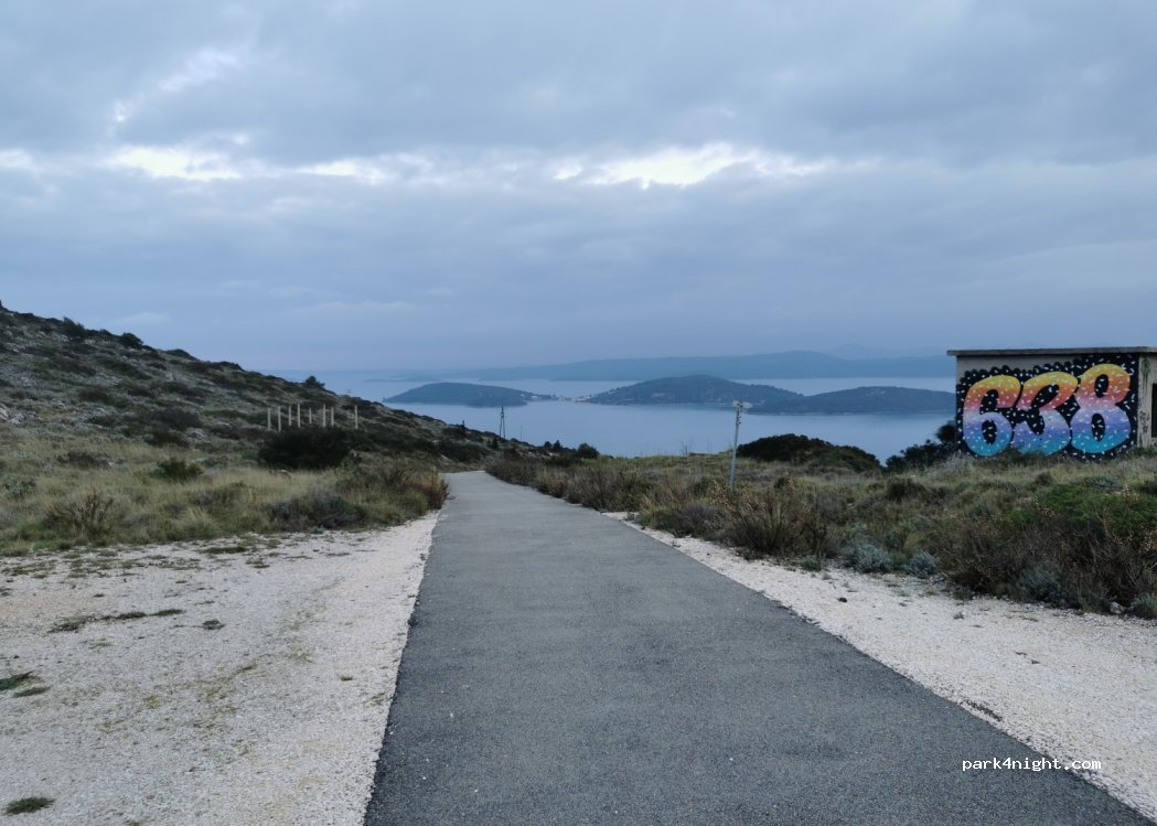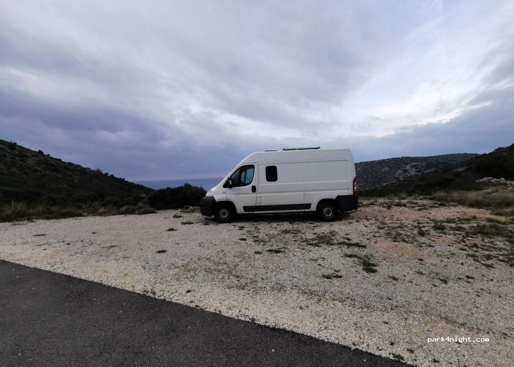 belle place, vue sur mer, très calme, rare endroit où on n'est pas réveillé par les cigales. nous avons fait deux nuits très bien. Attention, c'est la route de la grotte et le guide habite la première maison. le deuxième jour, il nous a barré la route, n'étant pas content qu'on ait dormi là. présence de rongeurs aussi qui ont visité le van et se sont nourris de notre éponge à vaisselle