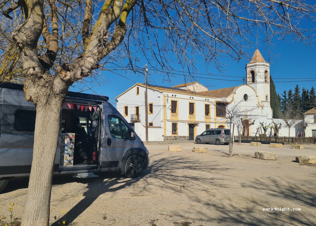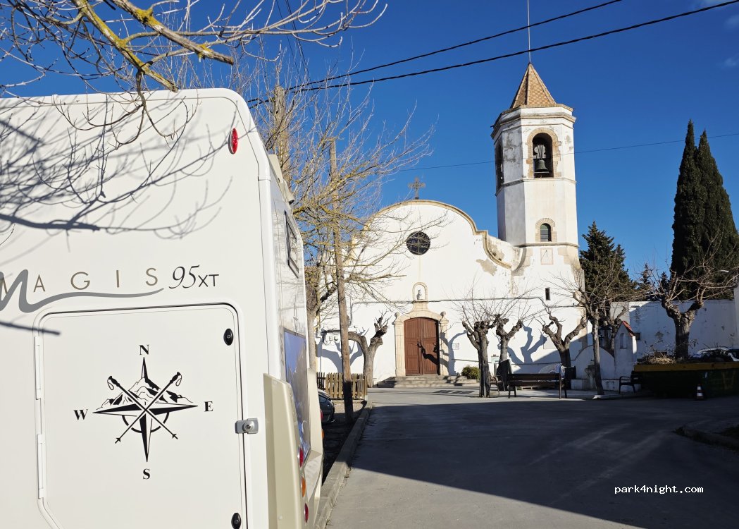 Parking in a square in the middle of a very small town. Views of the vineyards surrounding the place, garbage cans (Glass, containers, cardboard, organic). Very quiet and all flat.