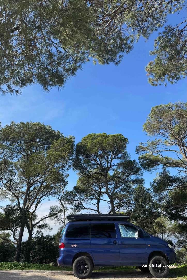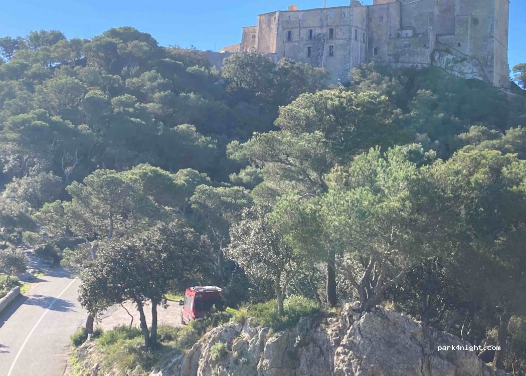 Small parking lot on the road to the San Salvador Monastery. Relatively flat. Great view, quiet. Road up winding, not too steep, asphalt in very good condition. Please keep it clean! Sleeps 3-4 at night.