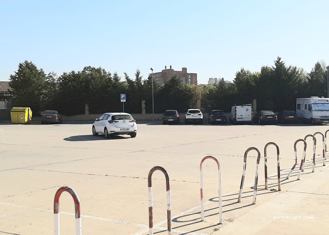 tipo coche:suv Tipo de lugar:Asfalto, aparcamiento normal Precio aparcamiento: Gratis Iluminación lugar:no, por la noche es oscuro total. Seguridad:Algunas cámaras vigilancia, se ve seguro y tranquilo Sombra:no, sin árboles Ruido:poco, carretera al lado y rodeado de naturaleza tranquila Tranquilidad:si Supermercados:si, día, lidl, mercadona, alcampo Otros:se puede mear en la naturaleza