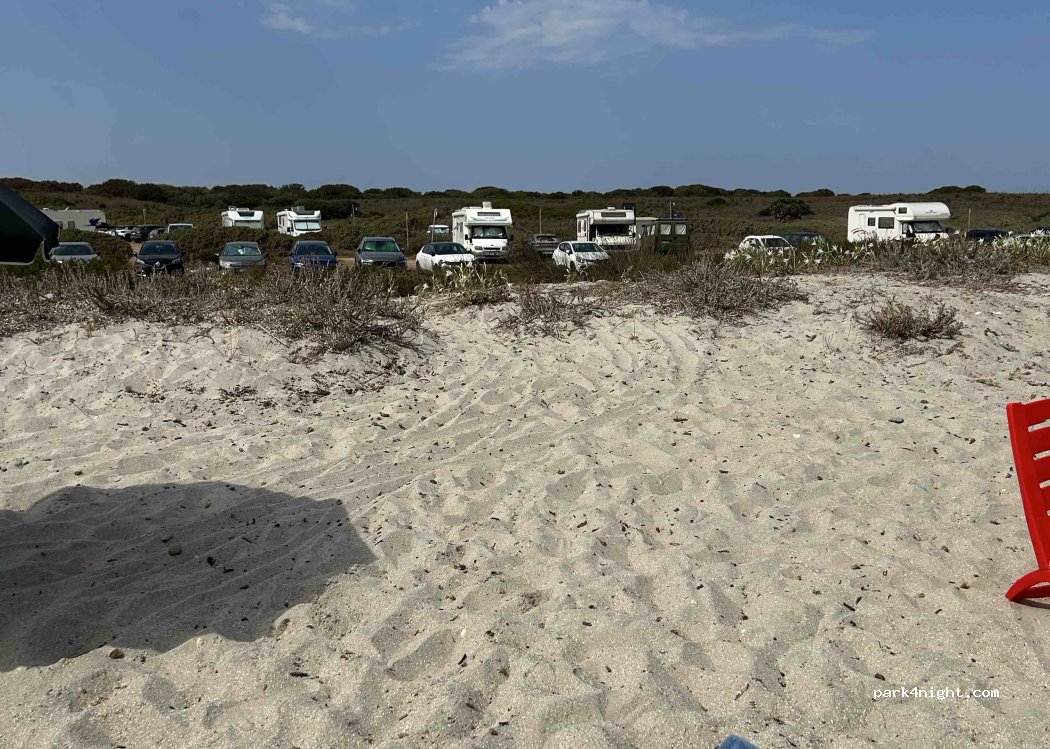 Parken nur im vorderen Bereich, strenge Kontrolle. ein Nachbar hatte Räder draußen und es kam sogar die Carabiniere. Stühle nur am Strand oder im Auto sitzen. In der Nähe von Porto Torres leider eine der wenigen geduldeten Möglichkeiten. kein Service, kein Klo, Müll in der Regel voll, da auch Locals morgens hier entsorgen. in der Nachsaison eher ein trauriges Plätzchen.