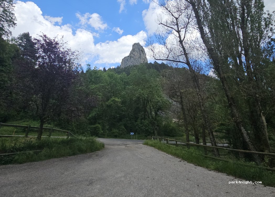 Sitio muy tranquilo para dormir. Pasamos dos noches seguidas en este sitio y es ideal. Espacio para varios coches, por la noche no hay problema para dormir, pero si llegas por la mañana lo puedes encontrar lleno de gente que va a caminar o escalar por la zona.