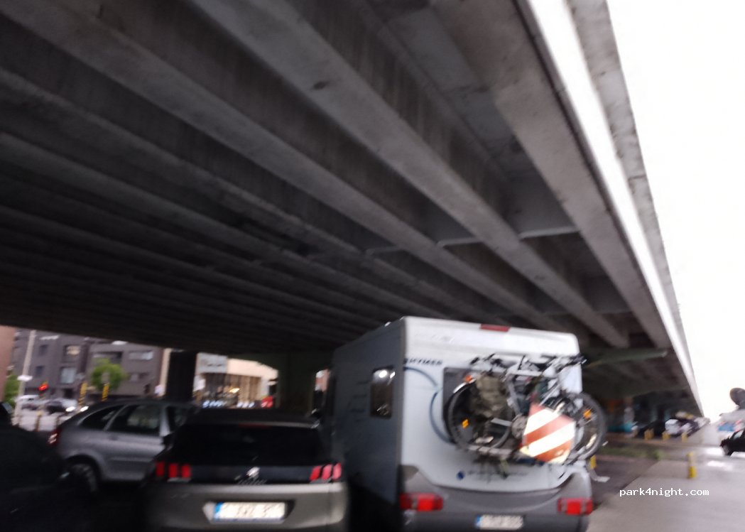Grand parking couvert adapté aux camping-cars de petite à très grande taille. Étonnamment calme la nuit malgré le fait d'être sous une route et de se sentir très en sécurité, de nombreux camping-cars et wagons se sont garés pour dormir. Aucune restriction de stationnement.