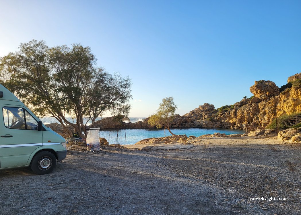 Extraordinaire. Baignade dans un lagon piscine naturelle très agréable à l’abri des vagues. Quelques chaises et bancs à disposition. Bien se garer en épi pour ne pas gêner les touristes grecs qui fréquentent l’endroit en nombre relativement bas. Nuit extrêmement calme et douce.