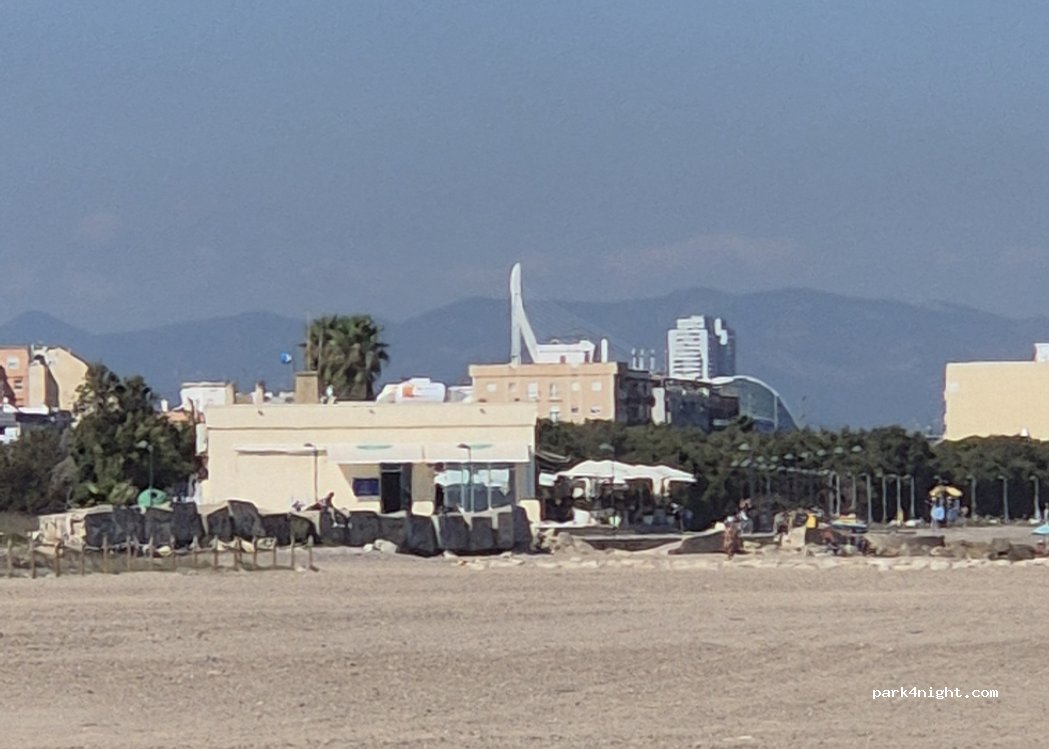 Parcheggio spartano ma chiuso da un cancello per cui sicuro. Ti viene consegnata la chiave che puoi lasciare in una cassettina di sicurezza prima di andartene. Durante la notte c’è una guardia che vigila. Non ci sono servizi se non un bagno chimico per poter scaricare le acque nere. Il centro di Valencia è raggiungibile in bicicletta in 20 min, lungo pista ciclabile quasi completamente illuminata