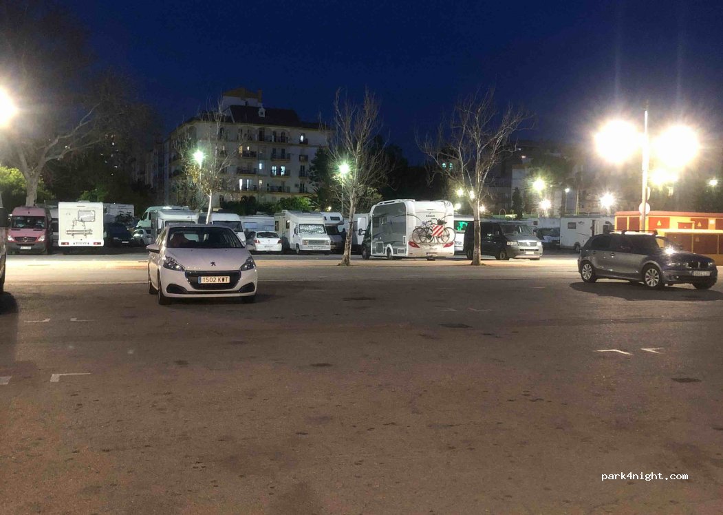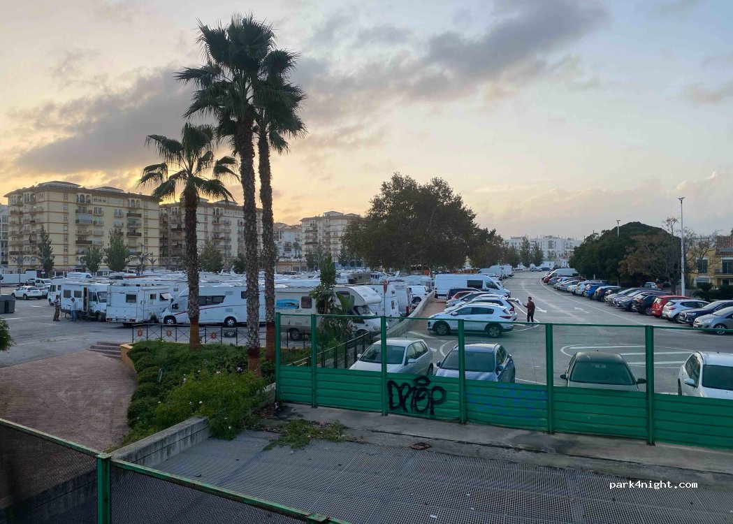 Es el parking de autocaravanas de Fuengirola, donde se permite pernoctar. No tiene servicios, ya he dormido varias veces y no he tenido ningún problema ni tampoco ruido excesivo excepto el murmullo típico de ciudad. Esta en un sitio muy centrico.