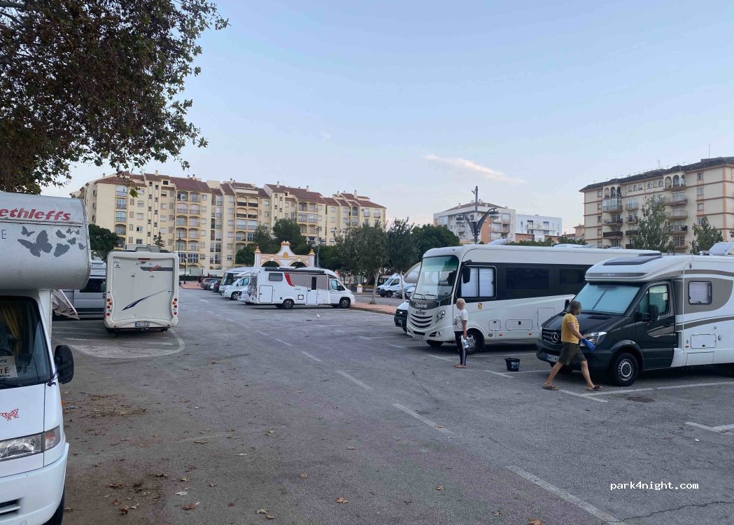 Aparcamiento asfaltado y plano en el centro de Fuengirola. Muchas AC de paso y fijas, noche tranquila y segura.