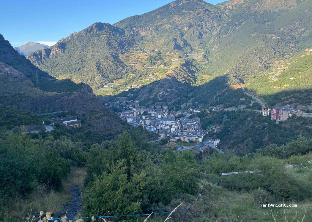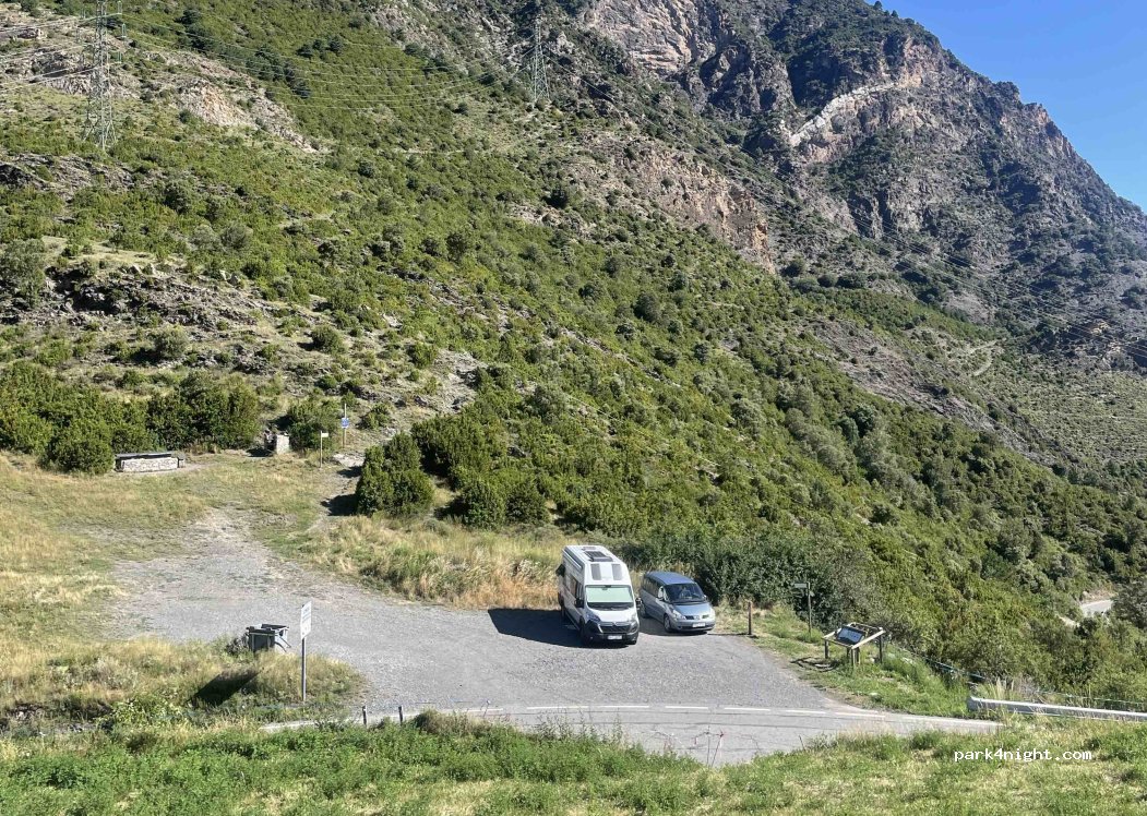 Nice gravel parking. Flat fot 2 cars. Picnic table and grill. You can make a hike jist straight for parking. It is next road but during night just few cars. Nice view to mountain and Sant Julia. Also trash can is there.