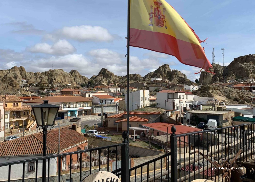 Parking space along the main street, in the center of the village which is worth the detour. We stayed there during the day to visit it as well as the local museum, located in a cave on 3 levels (the ground floor, inhabited by the owner can also be visited). Opposite the museum, very cheap take-out food. Very pleasant stage on the Granada side with superb views!