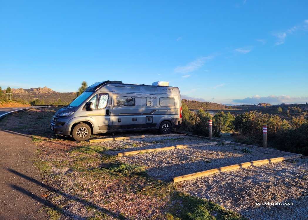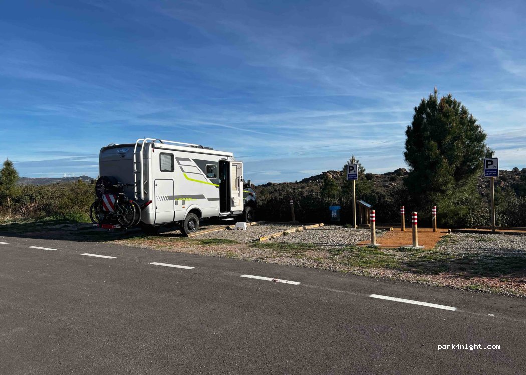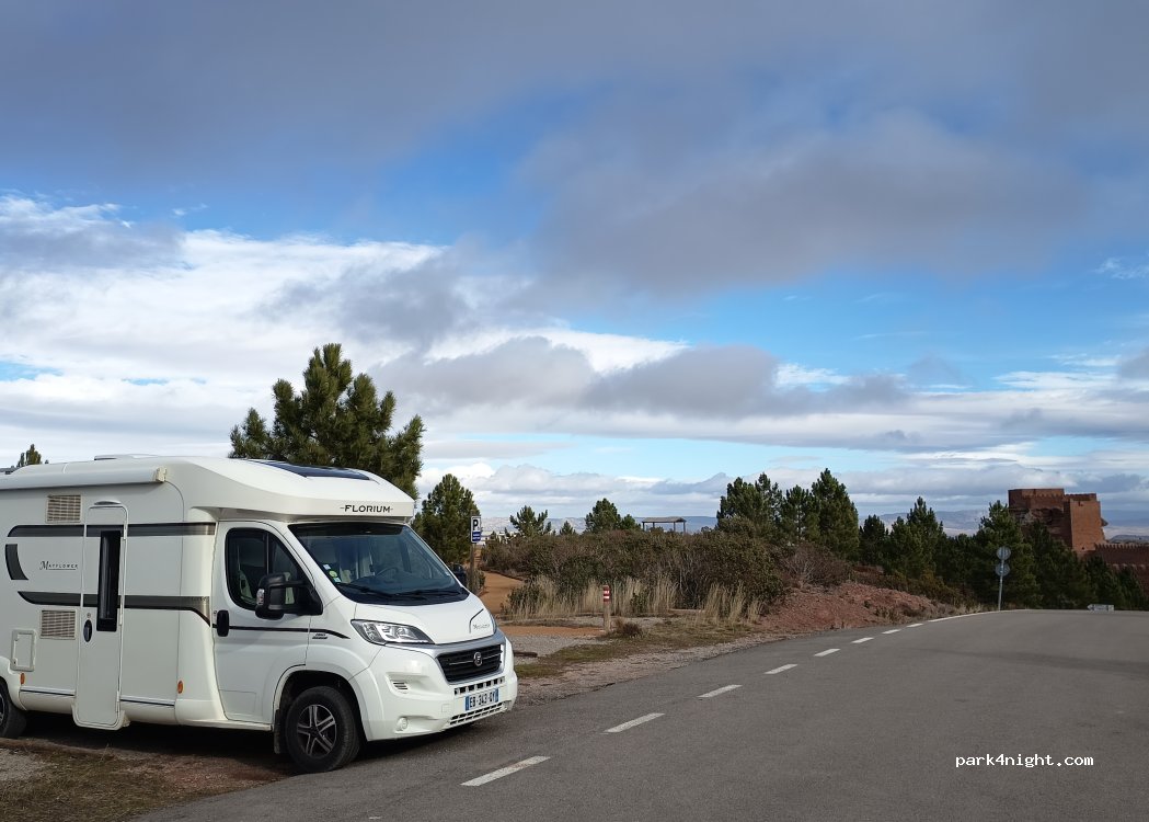 Parking del mirador del castillo de Peracense. Plazas niveladas al lado de la carretera recién asfaltada. Carretera sin tráfico así que la noche fue fantástica. Sin servicios. Lo mejor, las vistas y en noche despejada, el cielo estrellado espectacular porque no hay luces que impidan verlo. Cuidado que por la zona y la altura a la que se encuentra, la noche puede ser fría.