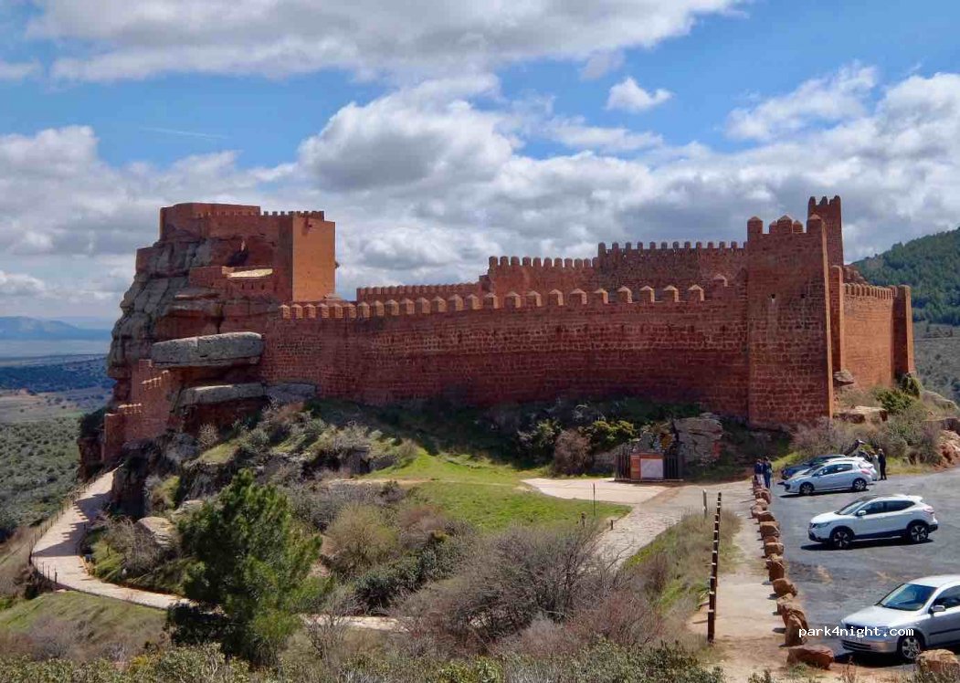 Ideal para pasar la noche, seis plazas dos de ellas adatados para minusválidos, bastante niveladas, para camper y autocaravana no más de seis metros, la vista al castillo son espectaculares, del mismo aparcamiento hay una senda con vista aun mirador, el castillo hay que visitarlo si o si