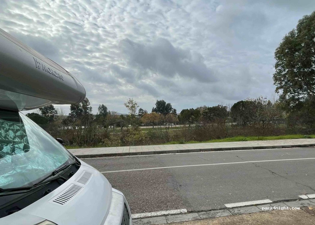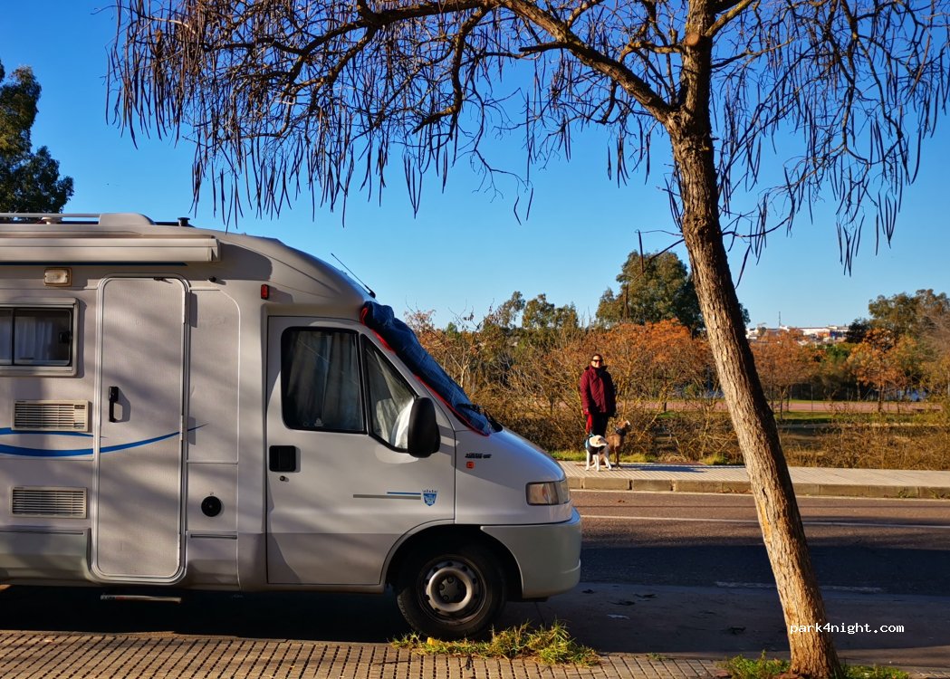 Sitio para pasar la noche tranquilo, varias plazas para aparcar, parque, bares y supermercados cerca, al lado del parque de la isla junto al río Guadiana, un bonito paseo, pasando por el puente romano hasta el casco antiguo, recomendable!