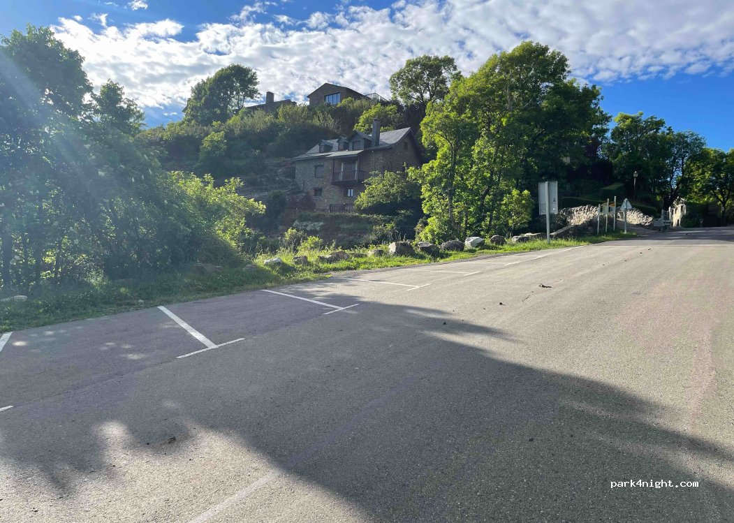 Bon aparcament amb places llargues per visitar el poble i anar caminant fins al mirador, però amb molta pendiente com per menjar-hi o dormir-hi.