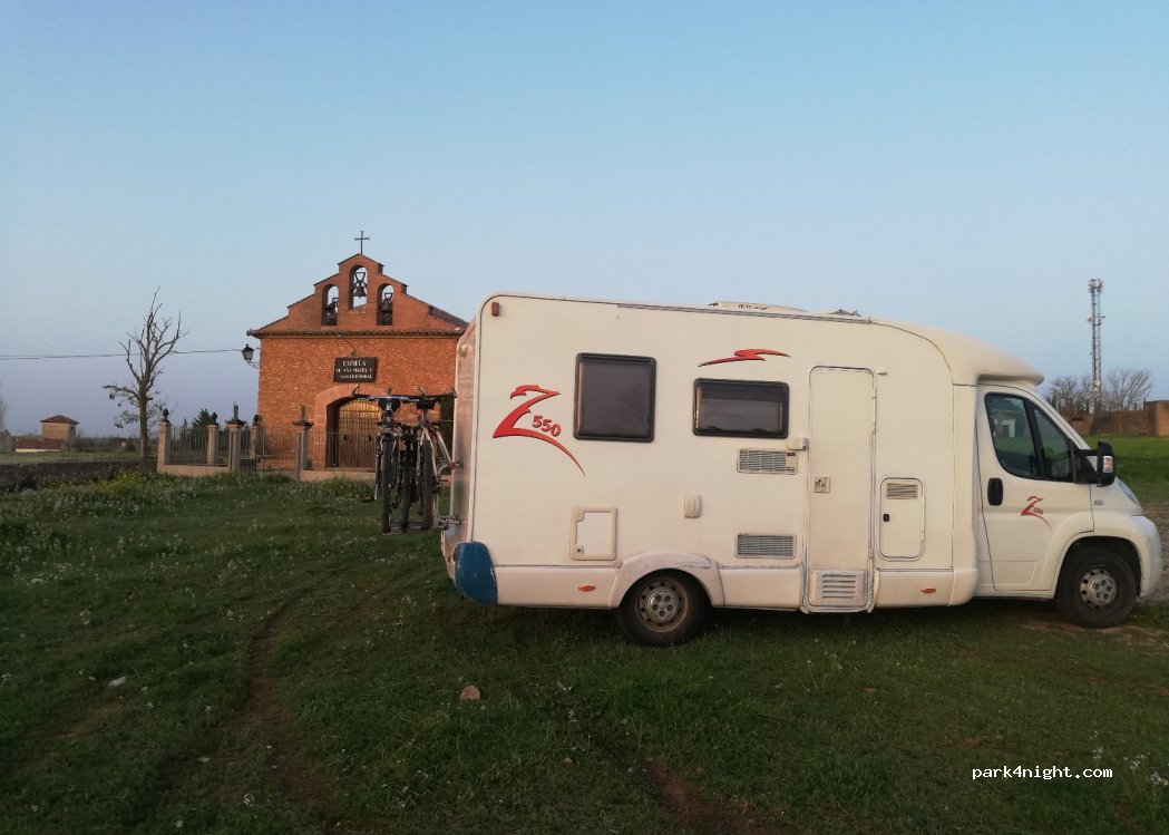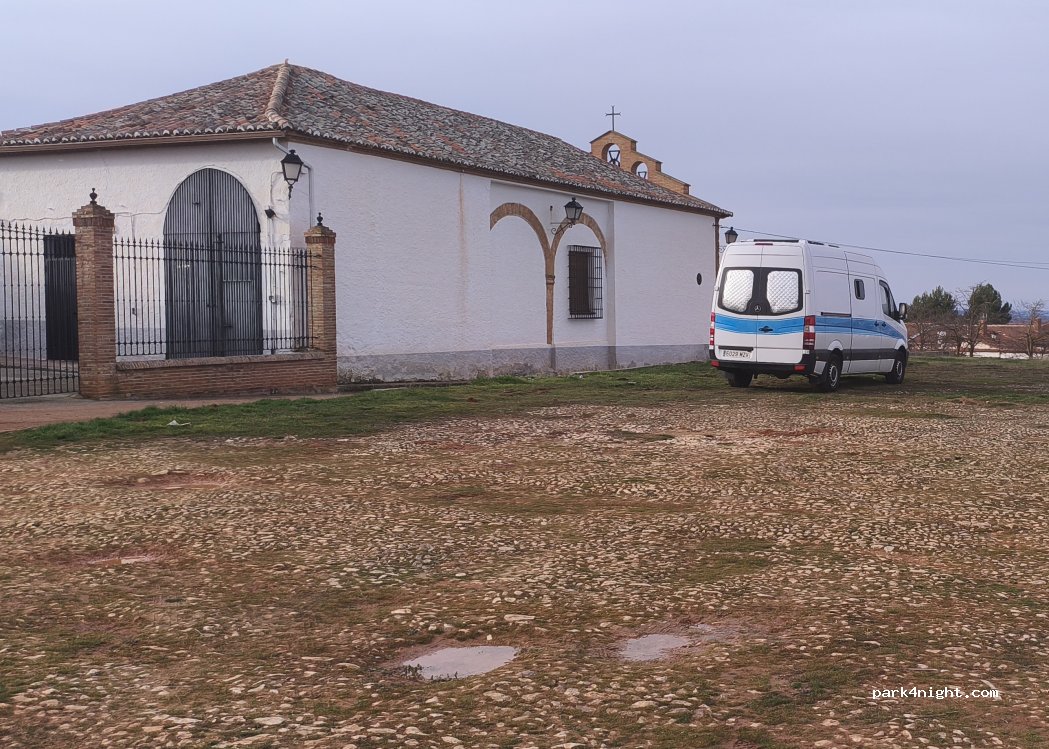 Aparcamiento sin servicios junto ermita de san Miguel y San Cristóbal. Llano y con espacio para 10-12 AC. Lugar tanquilo