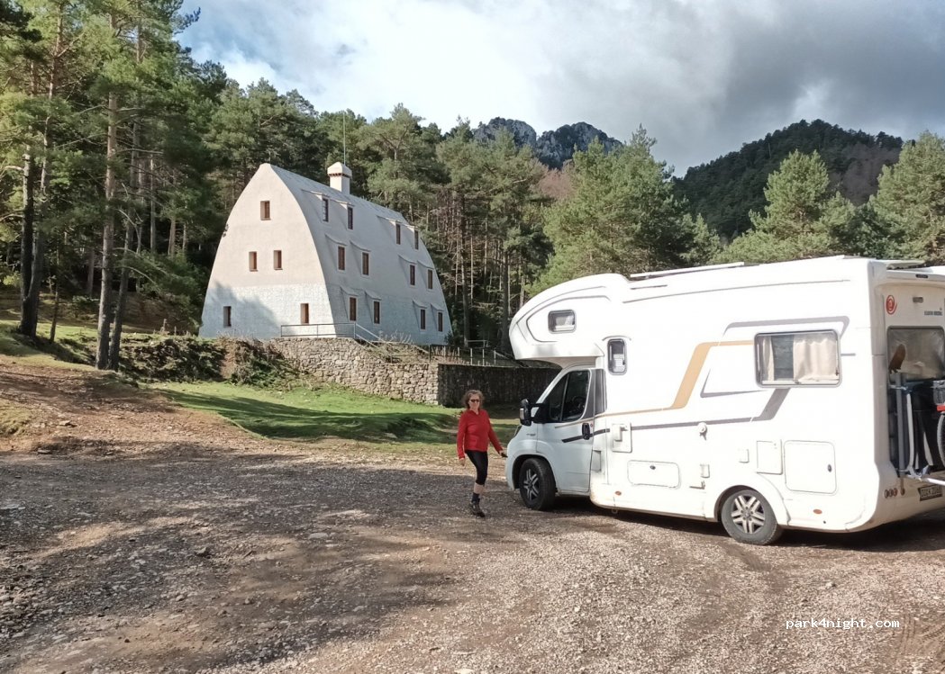 Questo insolito edificio di Antonio Gaudi si erge in mezzo al nulla. La calma assoluta regna qui a oltre 1300 m di altitudine. Piazzole pianeggianti senza altri extra a 2 km dal Mirador. NON salire da Lillet con un camper. Troppo stretto, troppo ripido e in cattive condizioni. Accesso solo dal Diseminado Santuari Sta Mare Folgars, ad ovest di esso.