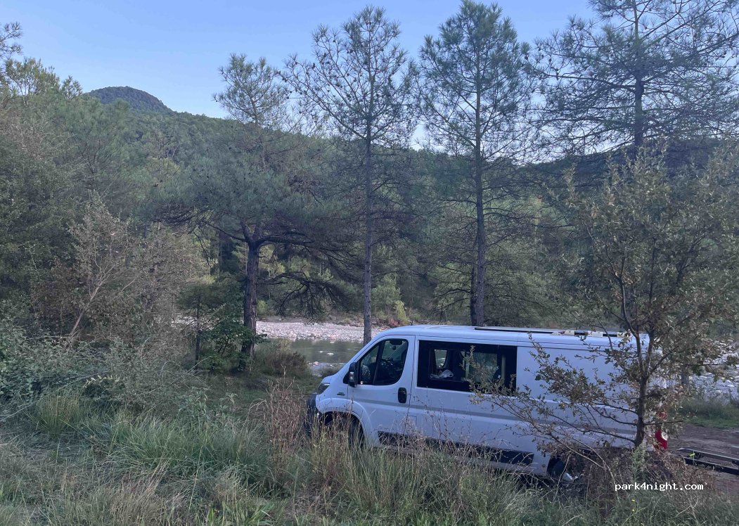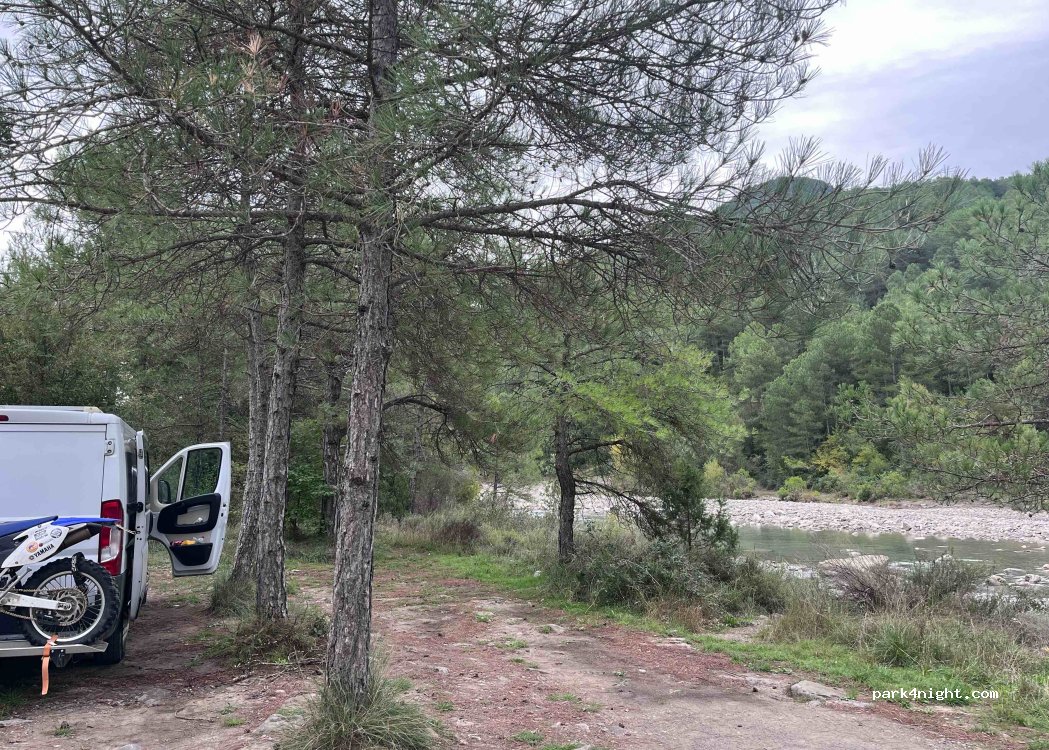 Small hole near the river, for two vans. Good access. There are trees and shade, but you can hear the cars passing by on the road right next to it (although it is not a road with a lot of traffic).