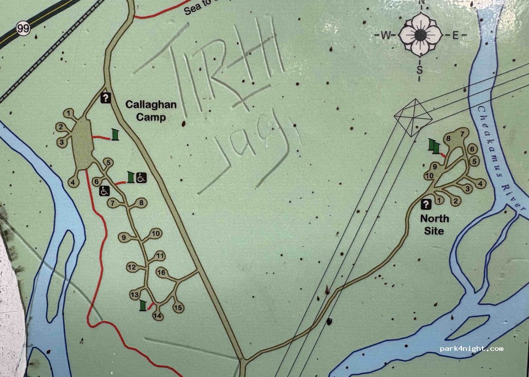 CalCheak recreatie site. Bosparkeerplaats met openbare toiletten en prullenbak. Elke plaats heeft een barbecue en een picknicktafel. Ligt direct aan de rivier, verder erg rustig.