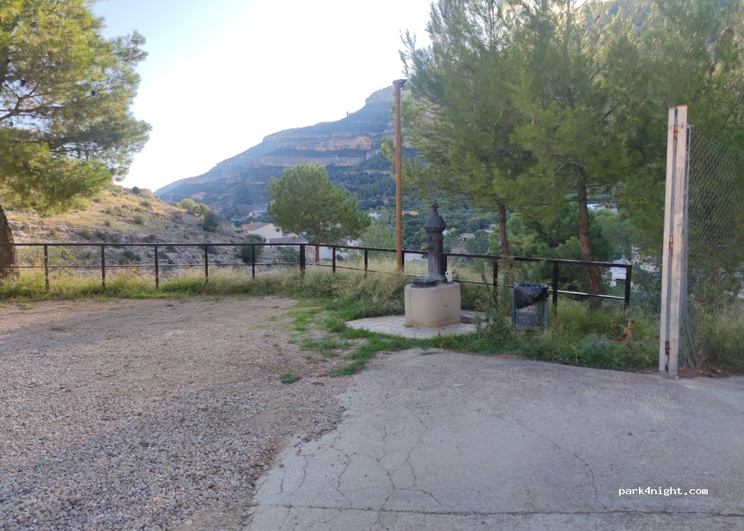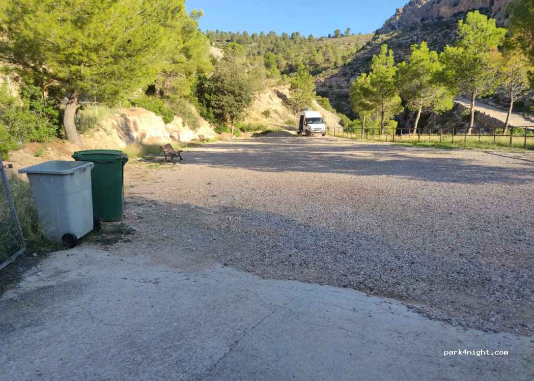 Explanada vallada de gravilla al lado del polideportivo. Cuenta con fuente y grifo en la parte de atrás, además de contenedor. Muy tranquila durante todo el día en general, pasamos 2 noches y genial. Por la mañana nos visitaron una familia de cabras montesas.