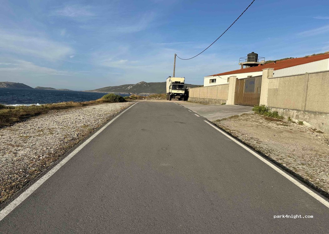 Schotterparkplatz am Ende der Straße direkt am Meer mit ruhigem Industriegebäude auf der anderen Seite. Als Garzas Michelin-Sterne-Restaurant 200 m entfernt neben einem zweiten Hotel / Restaurant. Auf der Route des Camino DOS Faros. Schöner Strand 700m entfernt.
