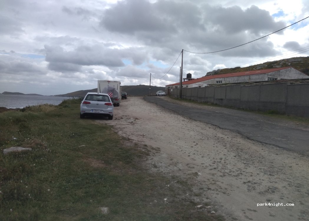 Gravel parking area at the end of the road right next to the sea with quiet light industrial building on the other side. As Garzas Michelin Star restaurant 200m away next to a second hotel/ restaurant. On the route of the Camino DOS Faros. Lovely beach 700m away.
