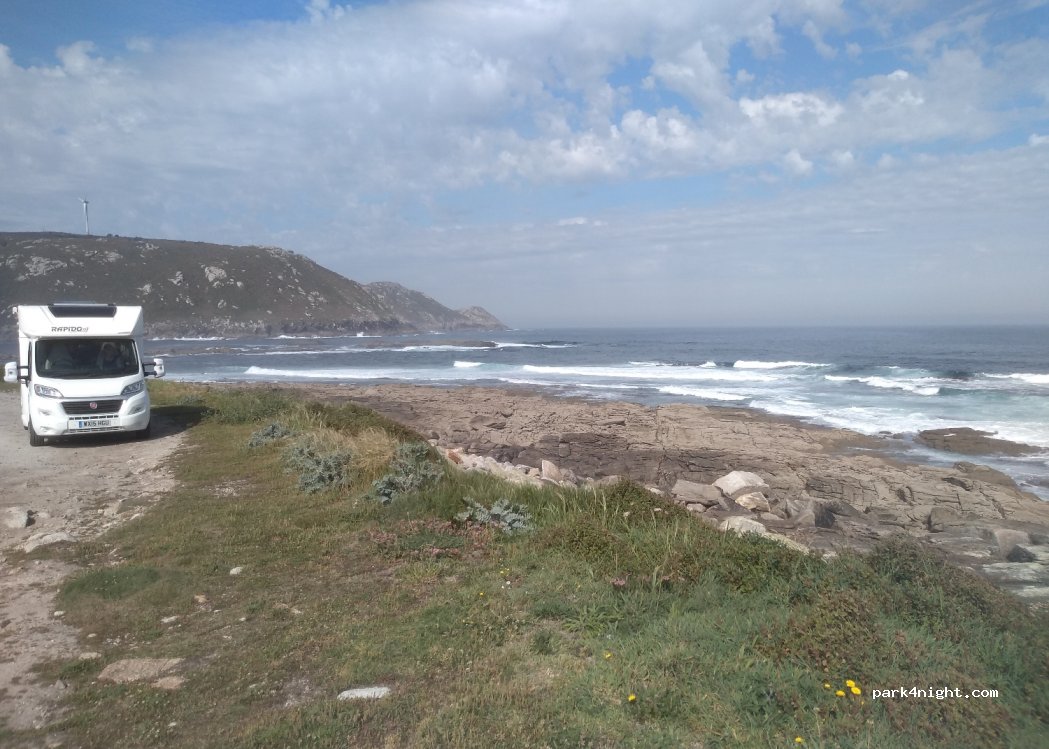 We spent a lovely peaceful night here, there were a couple of dog walkers in the morning. Don’t put chairs / awnings etc. out, the Civil Guardia showed up at 5 am on a Sunday to check us out, but left us alone. 1.5 km rugged coast walk to the beaches in the village. The oyster processing factory isn’t smelly and is closed at weekends.