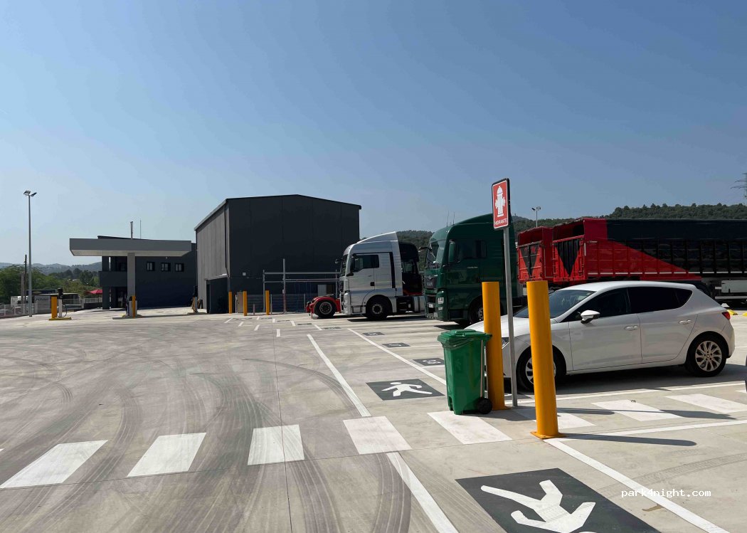 Parking poids lourds payant avec sécurité jour et nuit et barrière. Sur demande, nous avons été autorisés à y passer la nuit avec notre van (Fiat Ducato) moyennant des frais et à utiliser les installations sanitaires très propres et modernes (douche et toilettes). Un joli petit bar/bistro avec un très bon petit déjeuner et de la nourriture est également sur place. C'est un peu bruyant le matin car le parking est juste à côté d'une route. Une option sûre pour une visite à Barcelone, car il y a un haut niveau de sécurité sur tout le site.