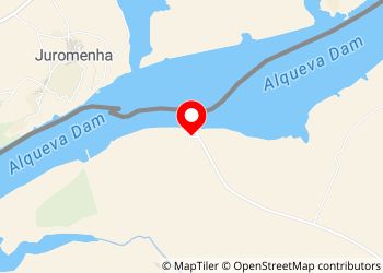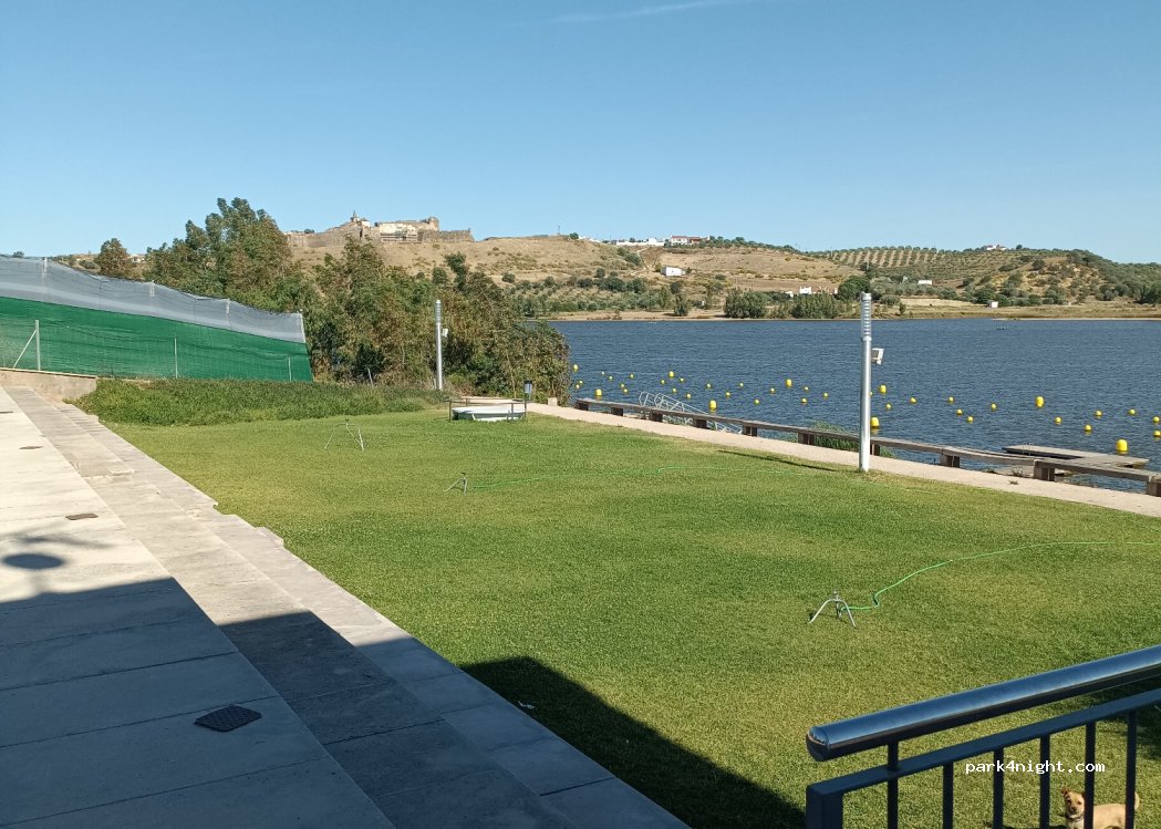 Plat libre P dans la rive gauche du fleuve Guadiana, ici le grand barrage/lac d'Alqueva, à côté du petit port de plaisance (= "embarcadero"). Aire de pique-nique sur la pelouse, balançoires et bar-restaurant. Belle vue sur le lac d'Alqueva, ancienne forteresse de Juromenha sur la rive opposée (Portugal). Point de vue astronomique très curieux (= mirador céleste”) qui est un disque blanc plat de 2 m de large entre les tables de pique-nique et l'eau, qui a une carte des étoiles activée de 22h00 à 24h00 au printemps et en été. Zone de baignade non surveillée.
